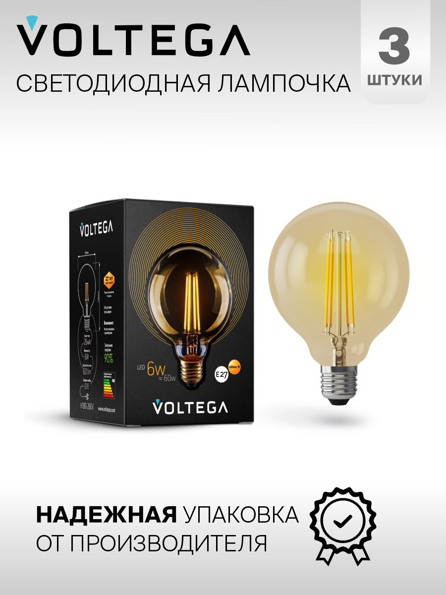 Отзывы на Лампочка cветодиодная Е27 в стиле лофт форма груша 6W теплый свет Voltega Loft 2800К упаковка 3 штуки