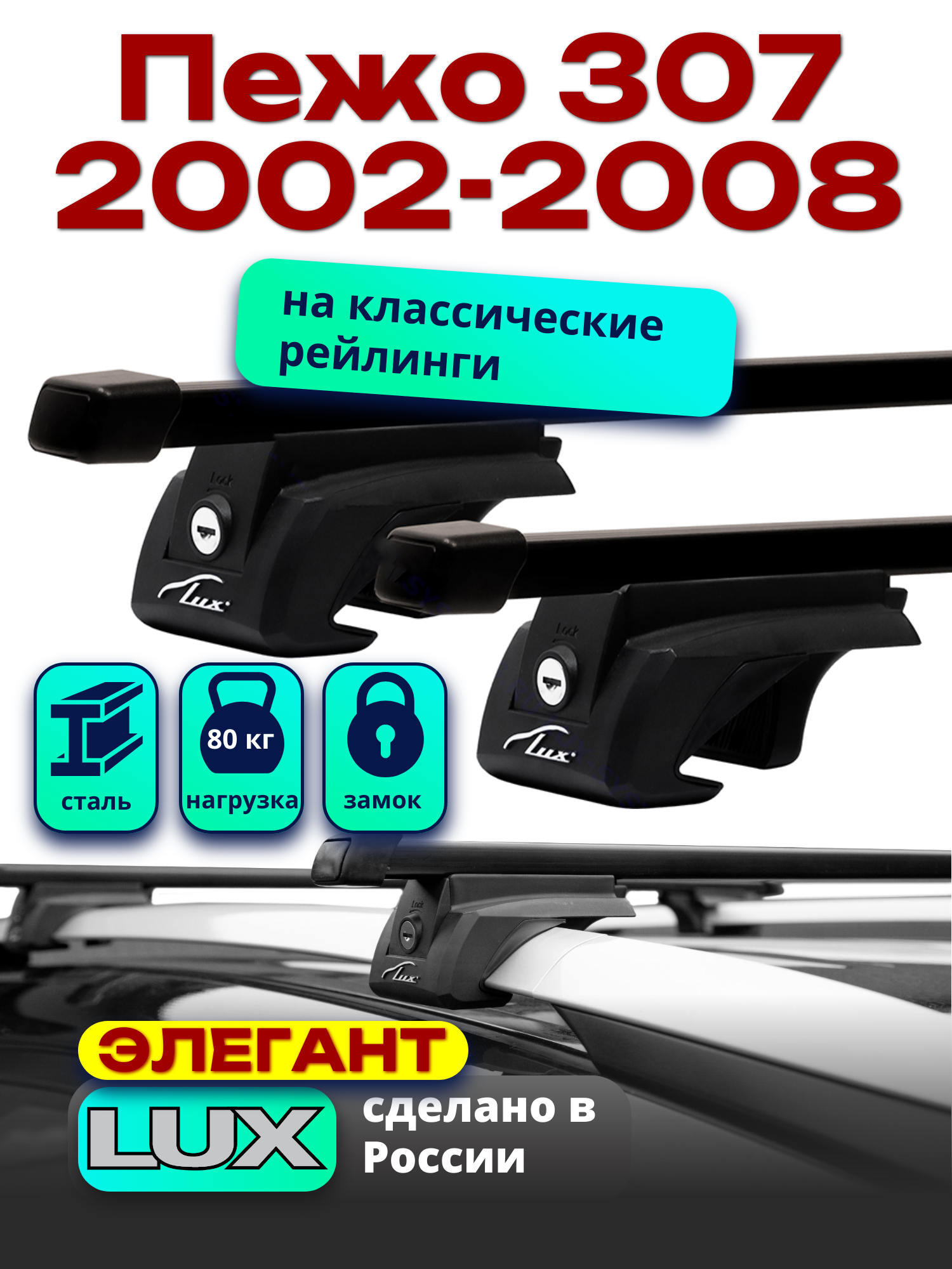 Багажник на крышу Пежо 307 2002-2008 на рейлинги, черный, прямоугольные дуги, LUX элегант информация: