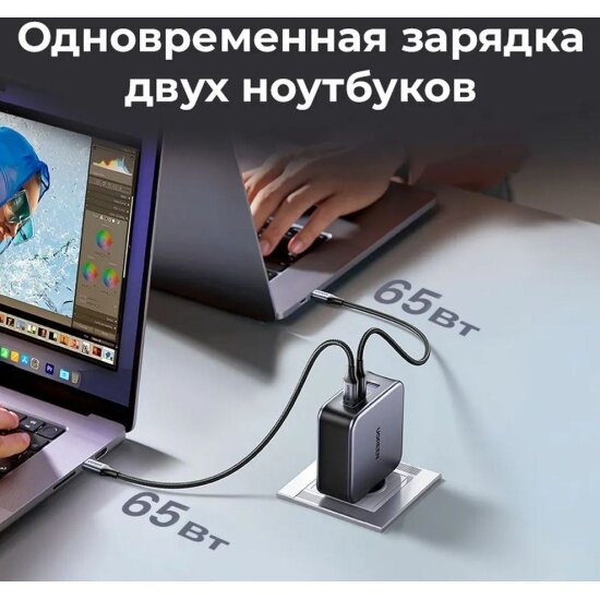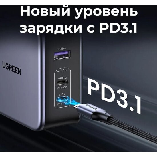 Отзывы на Сетевое зарядное устройство Ugreen CD289 USB-A+2*USB-C 140W GaN Tech Fast Charger с кабелем USB-C - USB-C, 2м, черный