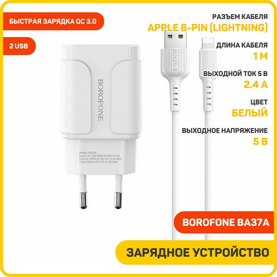 Сетевое зарядное устройство (СЗУ) Borofone BA37A (2 USB) + кабель Lightning, 2.4 А, белый информация: