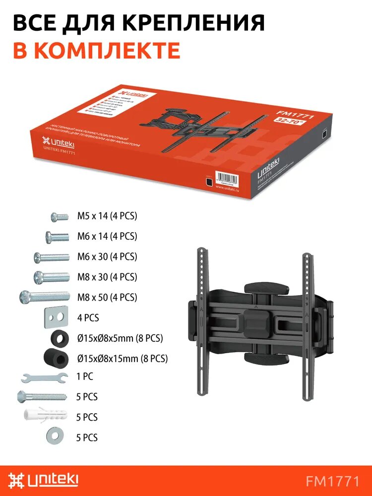Кронштейн крепление для телевизора на стену выдвижной наклонно поворотный диагональ от 32 до 70 дюймов UniTeki FM1771 черный информация: