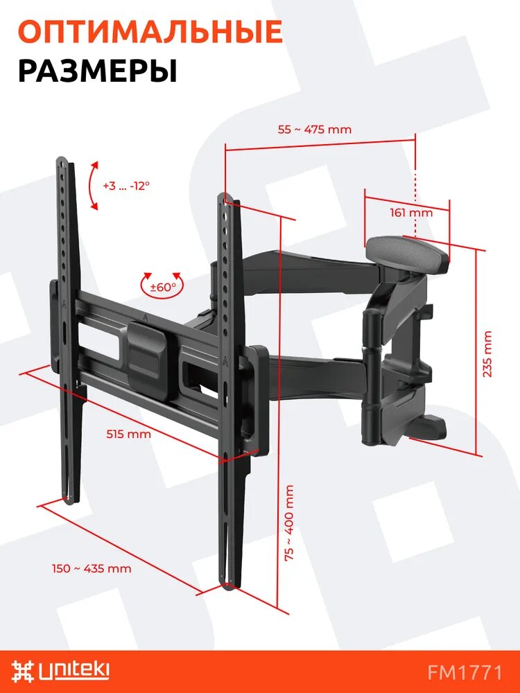 Отзывы на Кронштейн крепление для телевизора на стену выдвижной наклонно поворотный диагональ от 32 до 70 дюймов UniTeki FM1771 черный