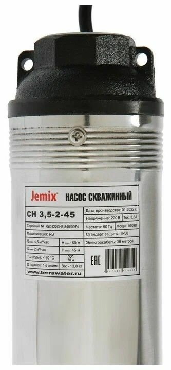JEMIX Насос скважинный JEMIX СН 3,5-2-45, центробежный, 550 Вт, напор 60 м, 75 л/мин, кабель 35 м 14 398 ₽
