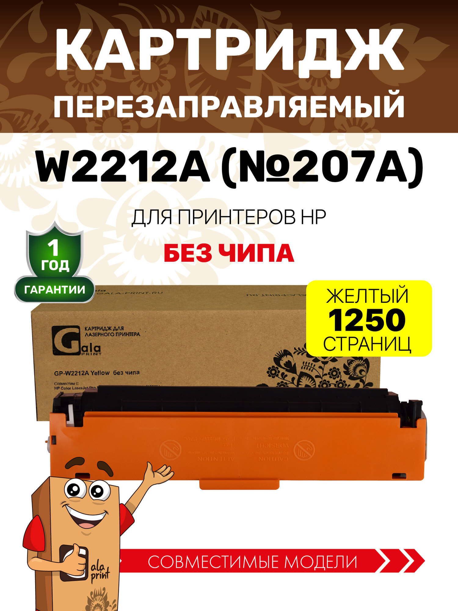 Картридж GalaPrint W2212A (HP 207A) без чипа для HP Color LJ Pro M255/M282/M283/M283 1250 копий лазерный, цвет желтый информация:
