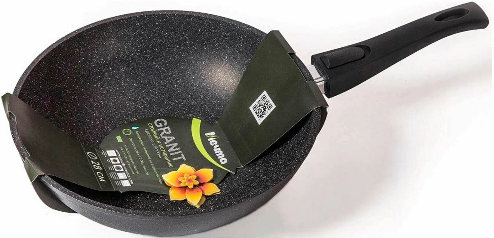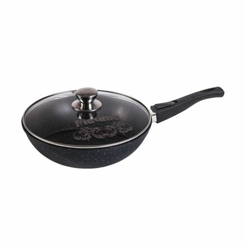 Сковорода вок Гранит со стеклянной крышкой и съемной ручкой антипригарное покрытие алюминий черный диаметр 28см объем 3.5л / сковородка для газовых и