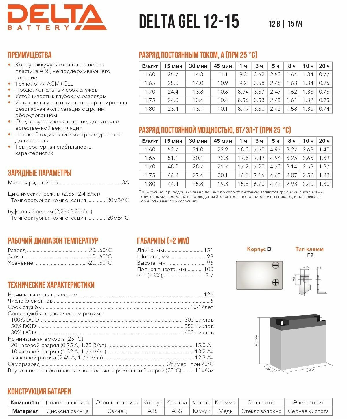 Аккумуляторная батарея Delta GEL 12-15 12V 15Ah аккумулятор для ИБП UPS информация: