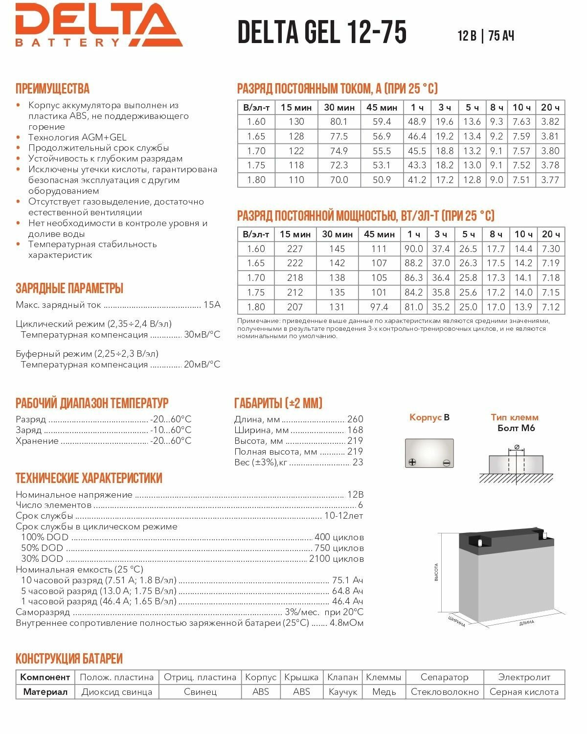 Аккумуляторная батарея Delta GEL 12-75 12V 75Ah аккумулятор для ИБП, UPS информация: