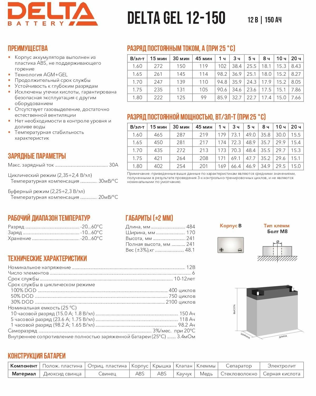 Аккумуляторная батарея Delta GEL 12-150 12V 150Ah аккумулятор для ИБП, UPS информация: