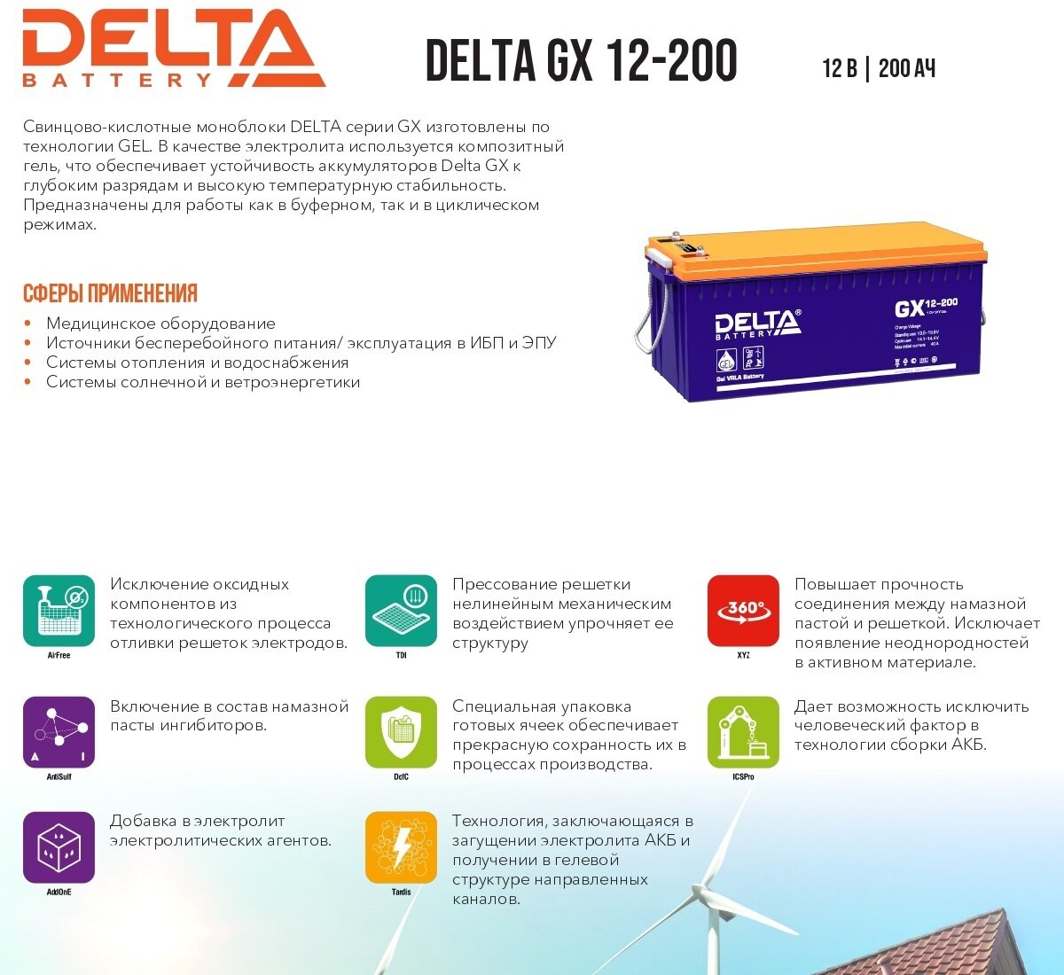 Аккумулятор Delta GX 12-200 12В 200Ач (12V 200Ah) гелевый информация: