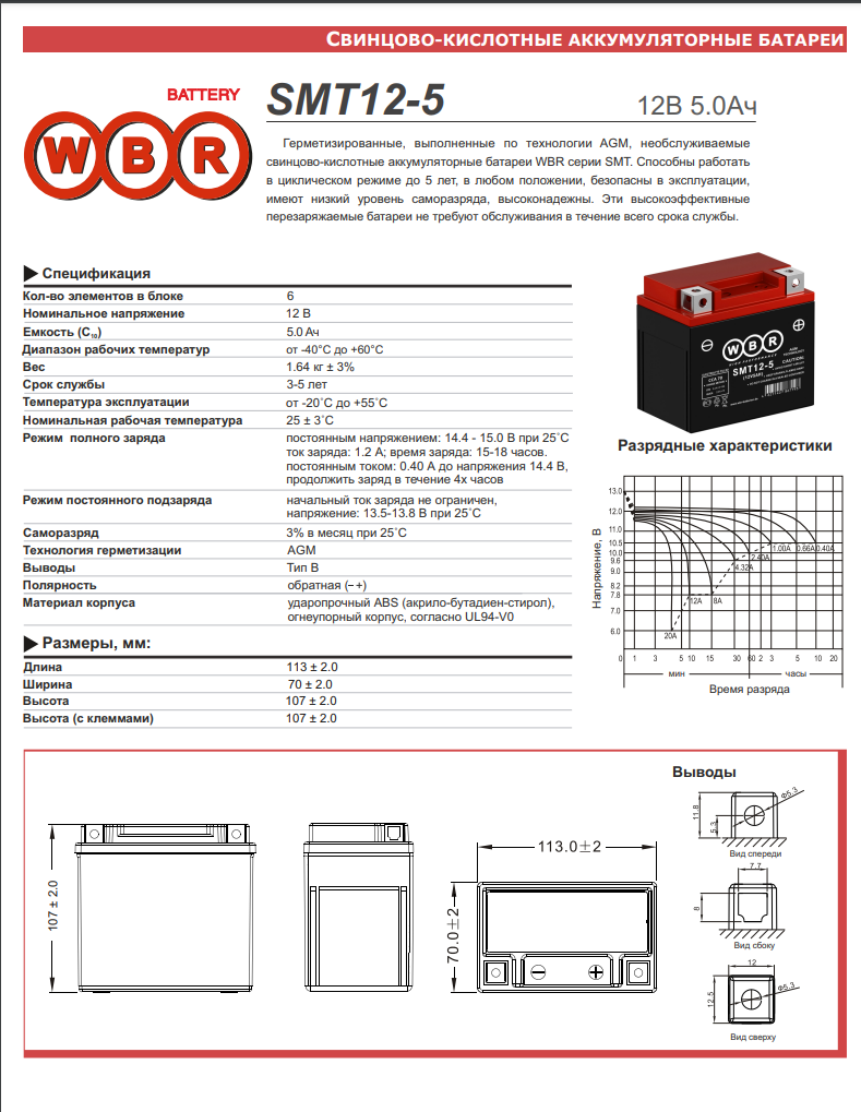 Стартерный свинцово-кислотный аккумулятор WBR SMT 12-5 для мототехники информация: