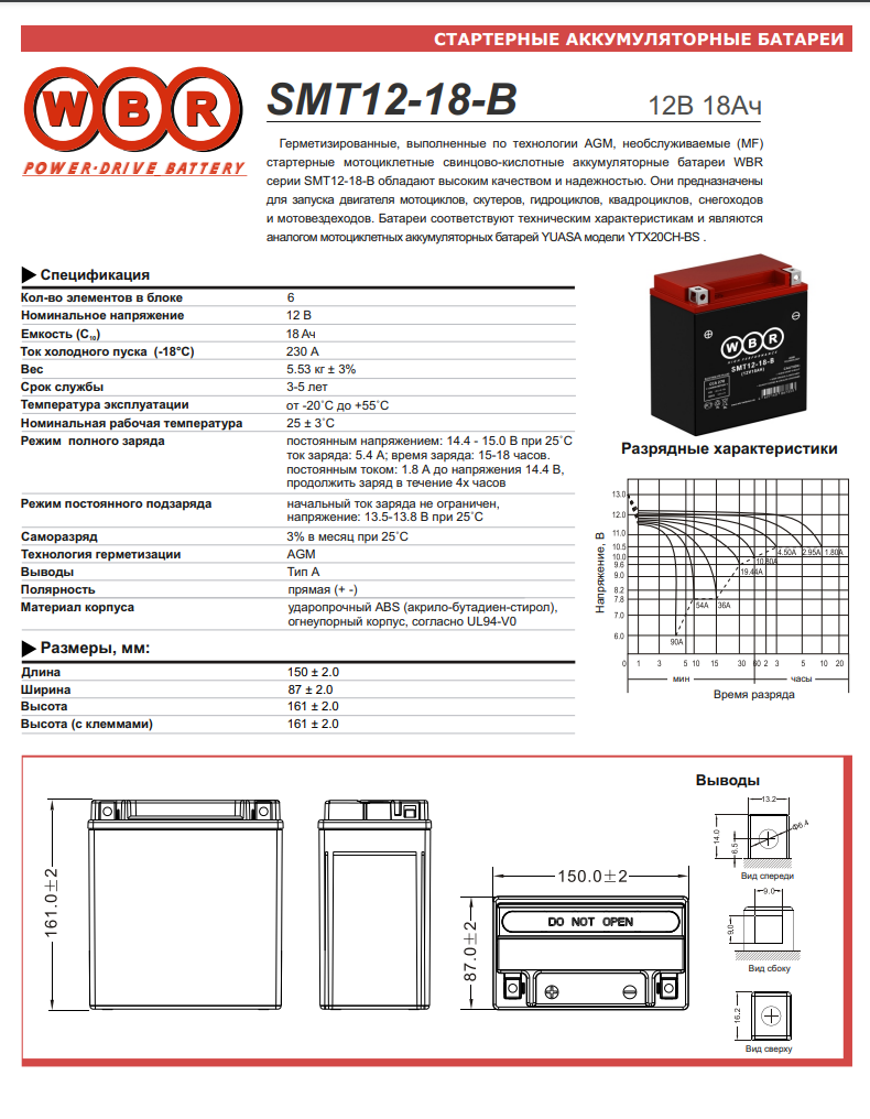 Стартерный свинцово-кислотный аккумулятор WBR SMT 12-18-В для мототехники информация: