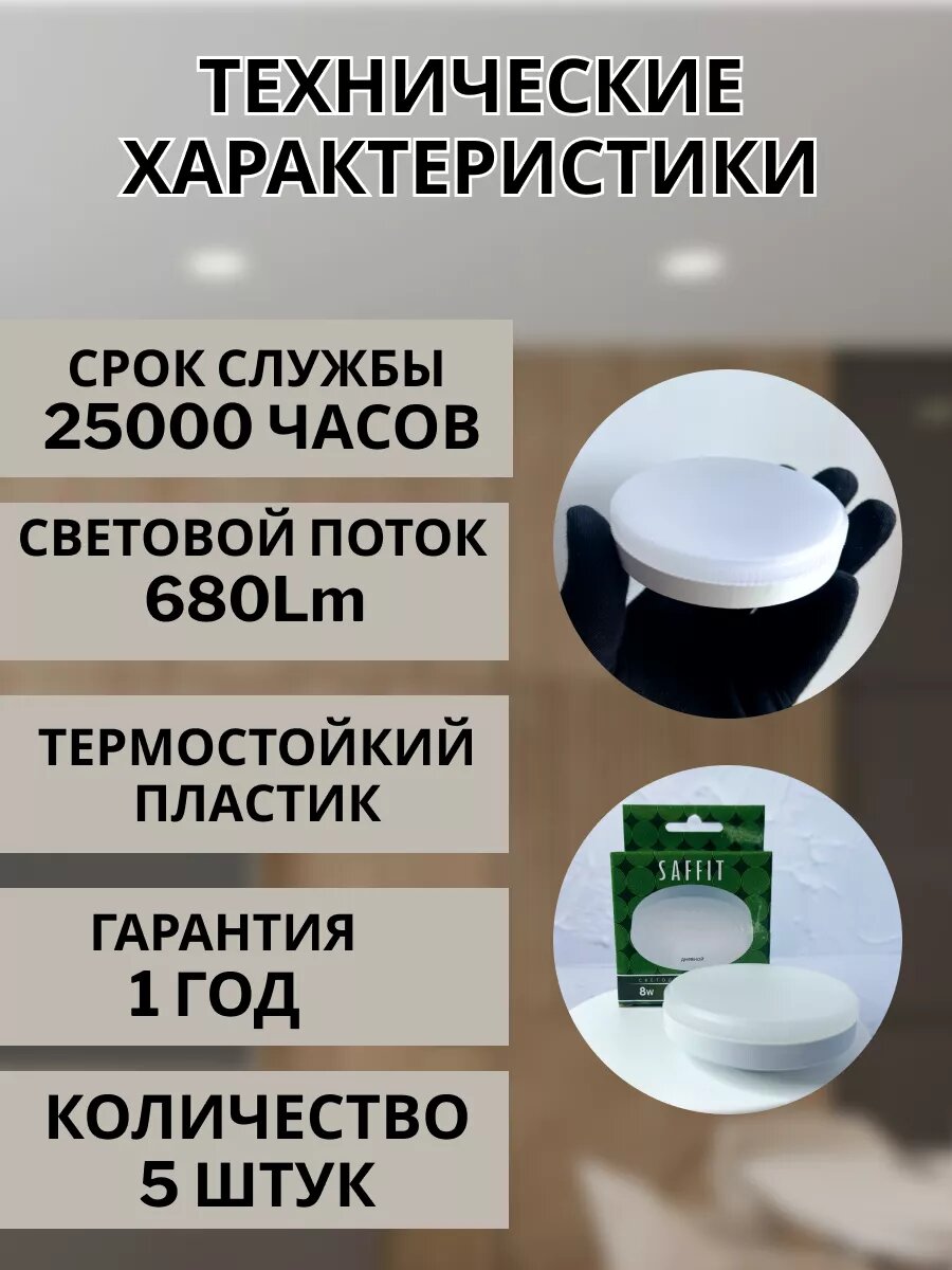 Лампа светодиодная SAFFIT SBGX5308, GX53, 8W, 6400K, дневной белый свет, 5 шт информация: