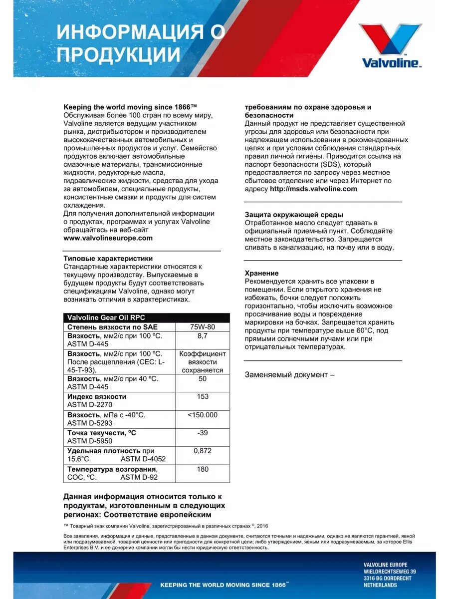Масло трансмиссионное 1л 75W80 Valvoline GEAR OIL 867068 информация: