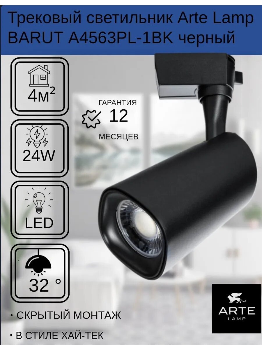 Трековый светильник Arte Lamp Barut A4563PL-1BK, LED, кол-во ламп:1шт., Черный