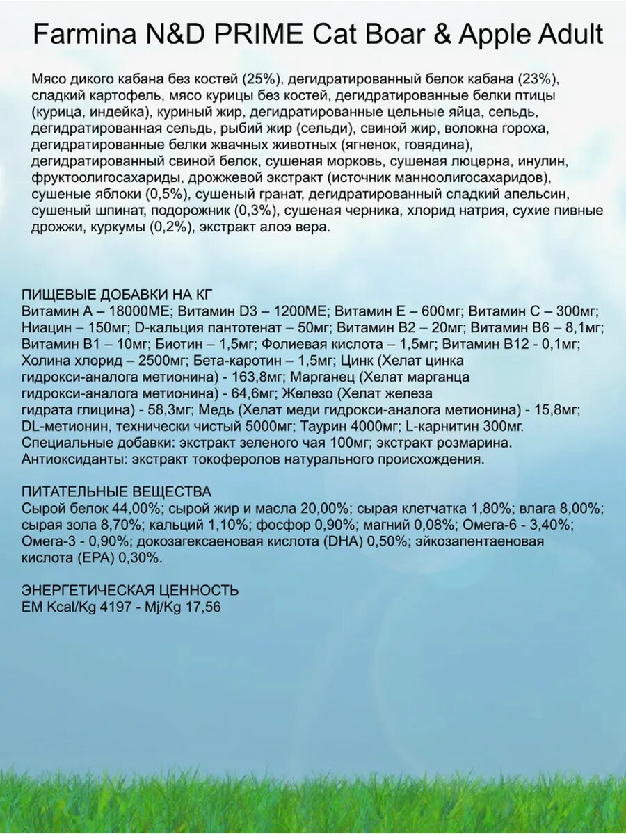 | Состав | свежее мясо дикого кабана без костей(25%), дегидратированное мясо кабана (23%), картофель, свежее мясо курицы без костей, дегидратированное мясо курицы, куриный жир, дегидратированные цельные яйца, свежая сельдь, дегидратированная сельдь, гидролизат животного белка, рыбий жир, волокна гороха, сушеная морковь, сушеная люцерна, инулин, фруктоолигосахариды, маннанолигосахариды, дегидратированные яблоки (0,5%), порошок граната, дегидратированный сладкий апельсин, порошок шпината, подорожник (0,3%), порошок черной смородины (0,3%), порошок черники, хлорид натрия, дрожжи сухие пивные, корень куркумы (0,2%), глюкозамин, хондроитин сульфат, экстракт календулы (источник лютеина) |