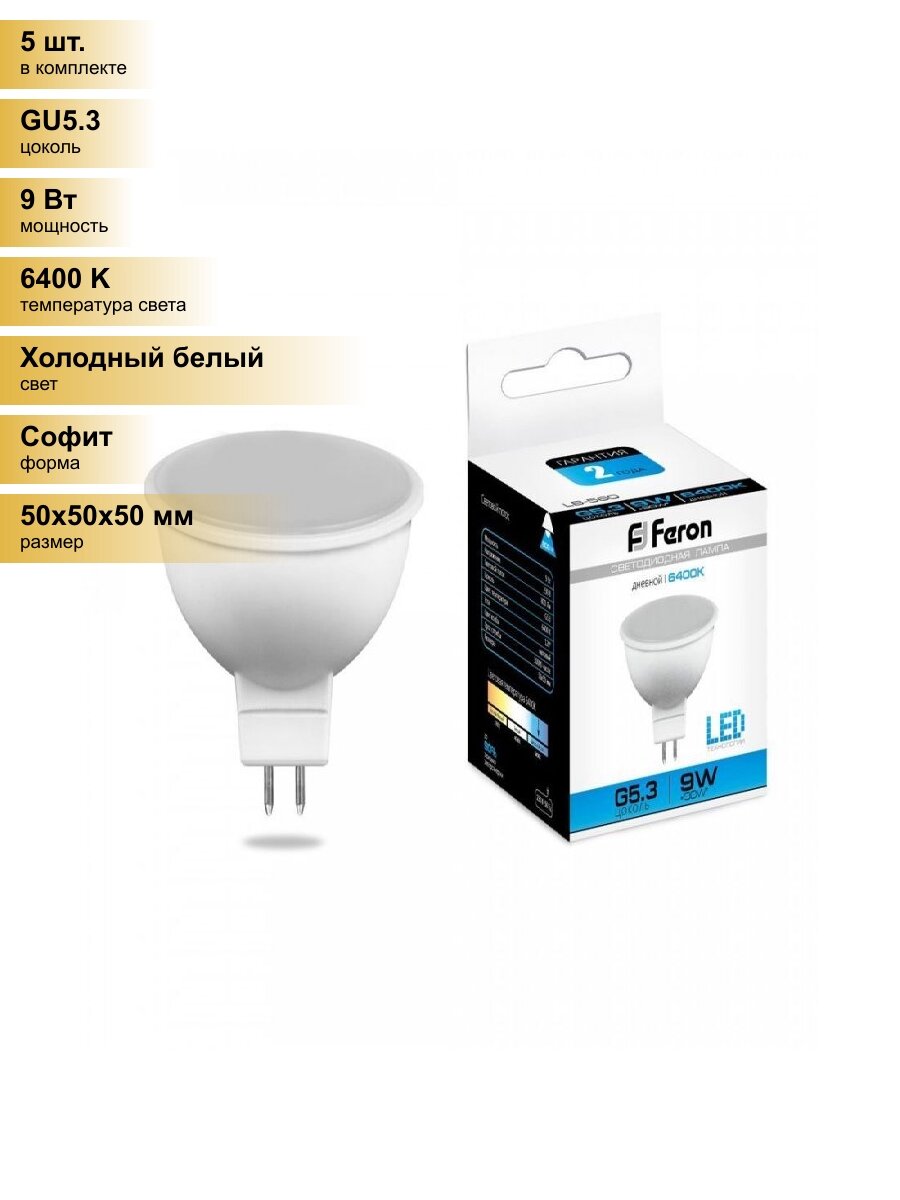 (5 шт.) Светодиодная лампочка Feron MR16 GU5.3 9W(800Lm) 6400K 6K 50x50 матовая LB-560 25841 Холодный белый. Цоколь GU5.3 информация:
