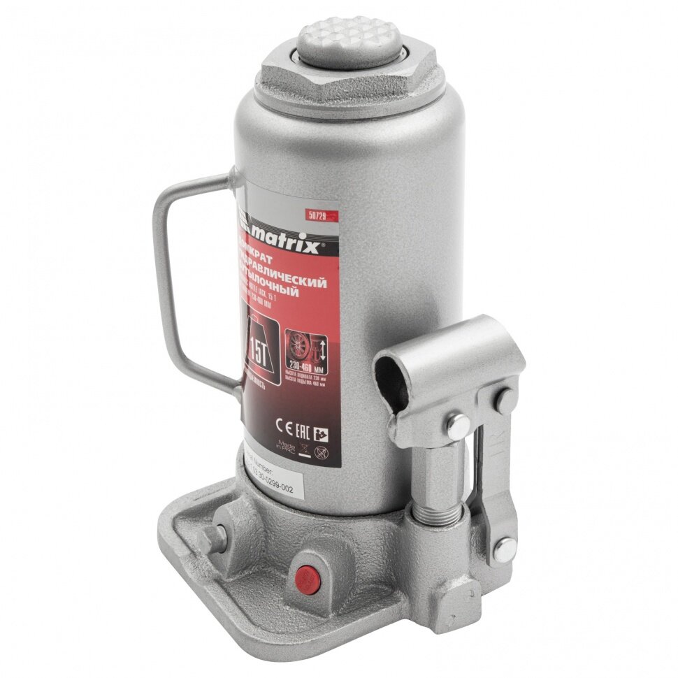Домкрат гидравлический бутылочный, 15 т, высота подъема 230-460 мм, MATRIX Master 50729 50729