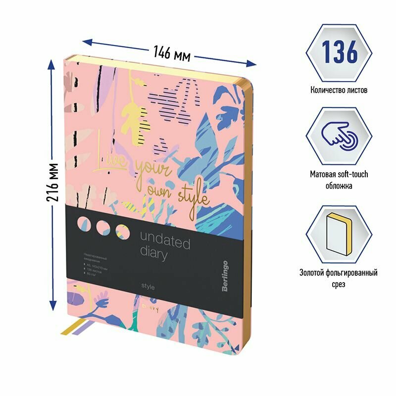 Ежедневник недатированный Berlingo А5, 136 листов, Style, золотой срез, розовый, с рисунком 874 ₽