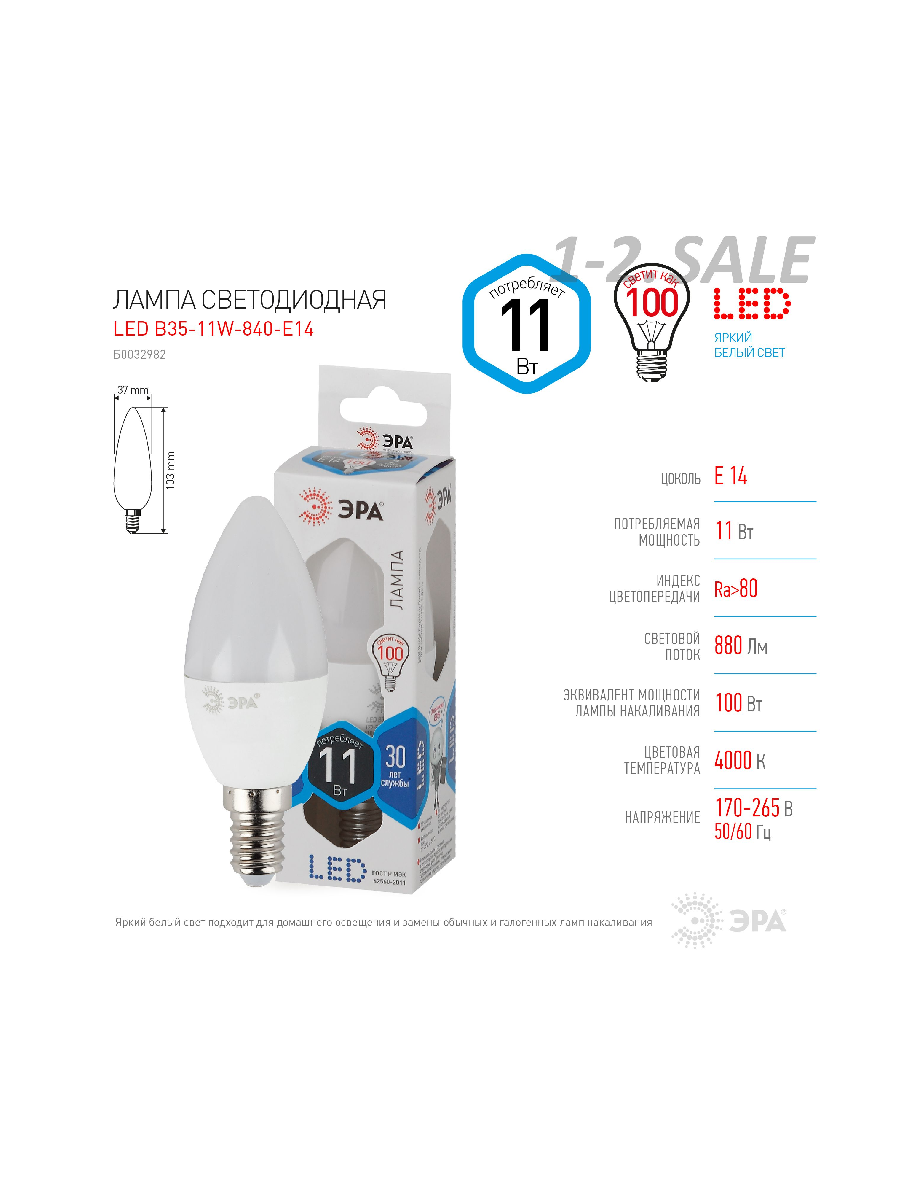 10 цен на (2 шт.) Светодиодная лампочка ЭРА стандарт свеча B35 E14 11W(880lm) 4000K 4K 2363 Нейтральный белый. Цоколь E14
