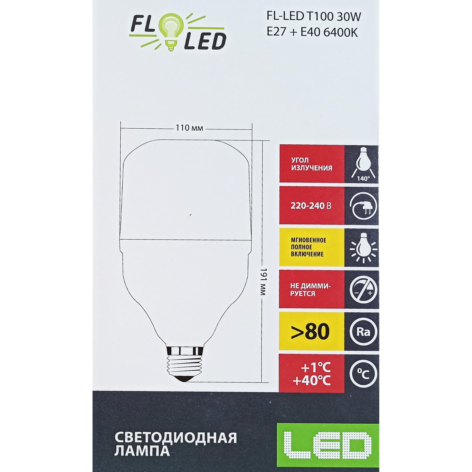 10 цен на 10шт/уп. Лампа LED Бочонок 30Вт 220-240V E27+E40 T 2800Лм 6400К Угол 140 град. D-100mm L-191mm Промышленная лампа высокой мощности. Лампа для наружного применения. Не использовать в закрытых светильниках Свет Холодный белый Foton Lighting, уп. 10шт