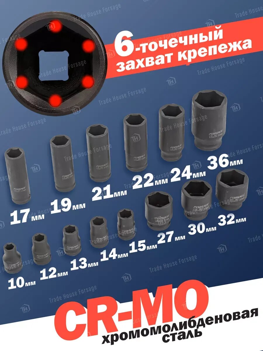 Набор головок 1/2, ударные, 14пр., короткие:10,12-15,27,30,32мм,глубокие:17,19,21,22,24,36мм FORSAGE F-4149MPB | цена за 1 шт