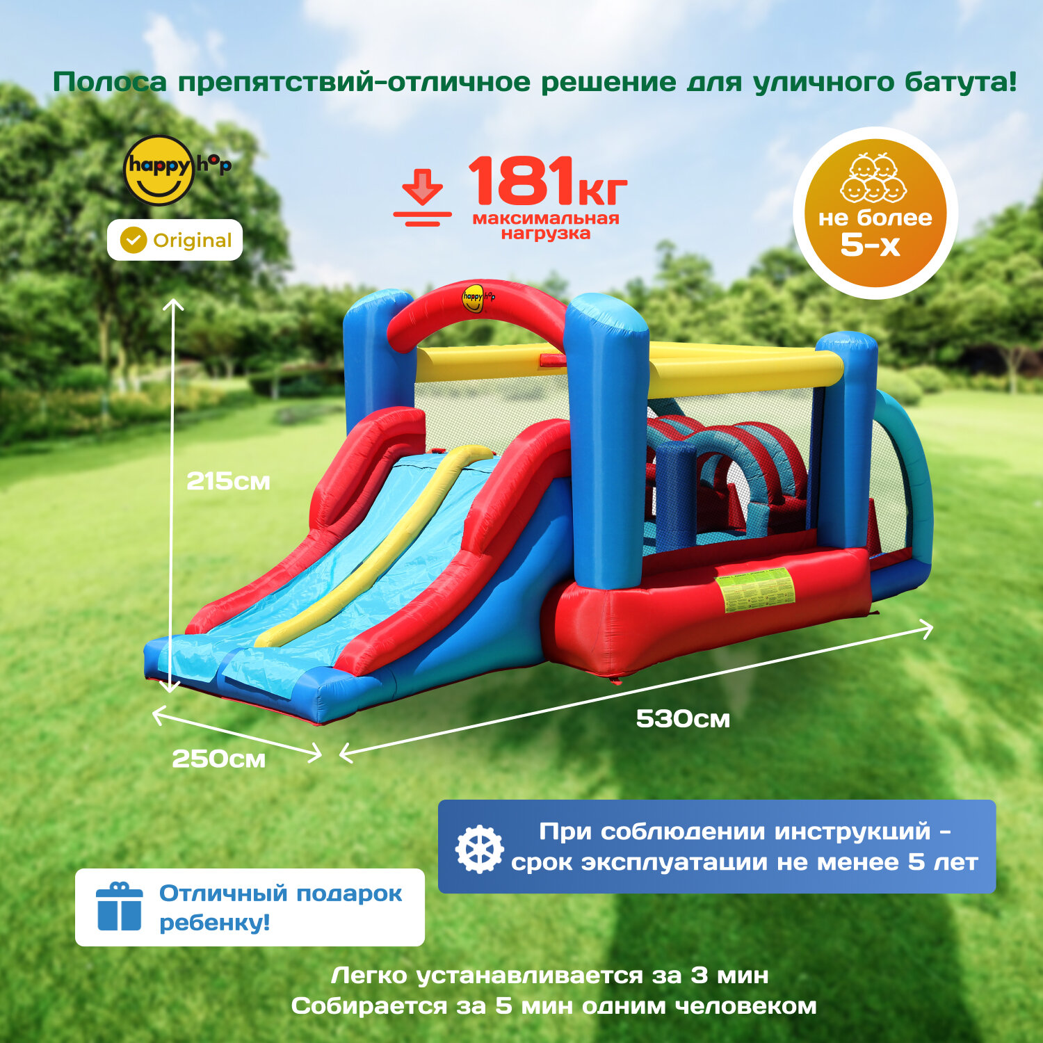 10 цен на Детский Надувной батут для дома и улицы Happy Hop "Неожиданные препятствия", с горкой, с защитной сеткой, 530х250х215 см