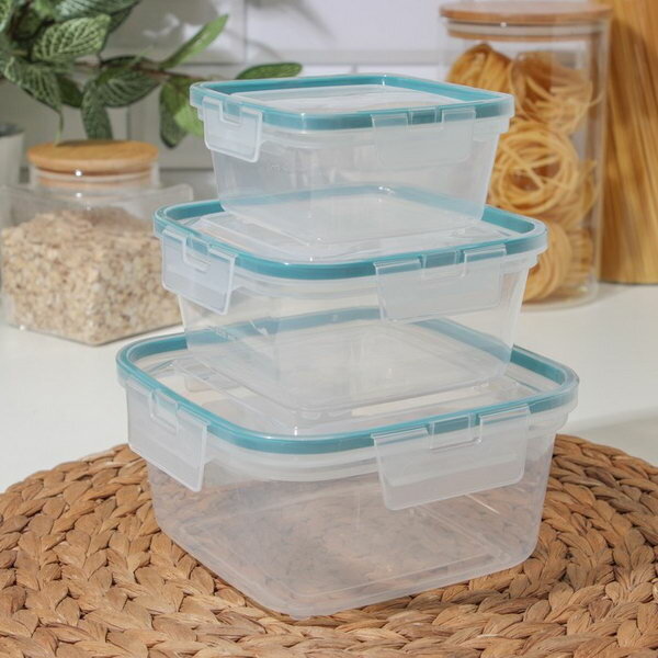 Комплект контейнеров для продуктов с защёлкой, герметичная крышка, 3 шт, 400 мл, 800 мл, 1,5 л, квадратные, цвет прозрачный