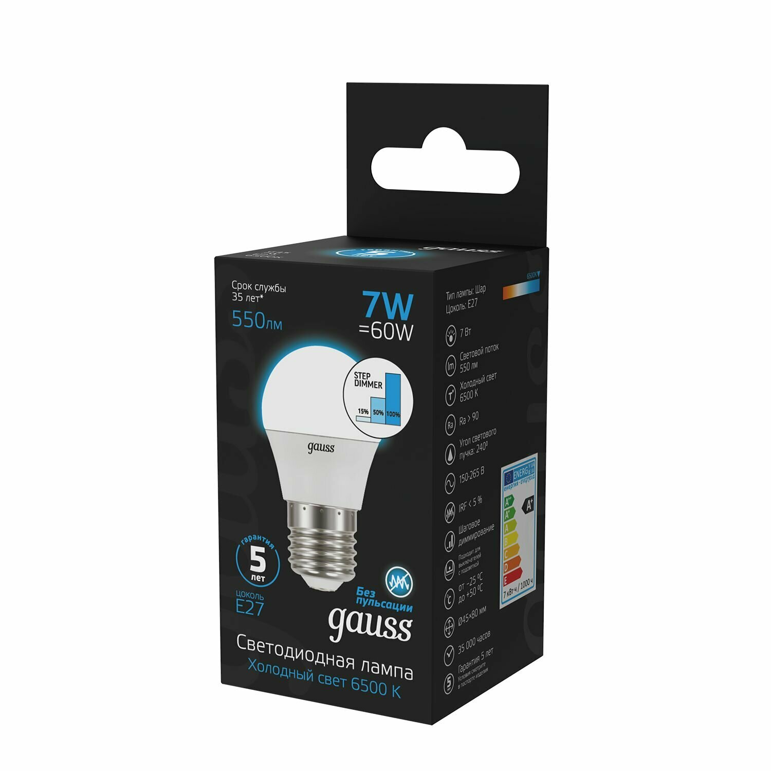 Светодиодная лампа Gauss "Шар" 7Вт 550Лм Е27 6500К Шаговое диммирование информация: