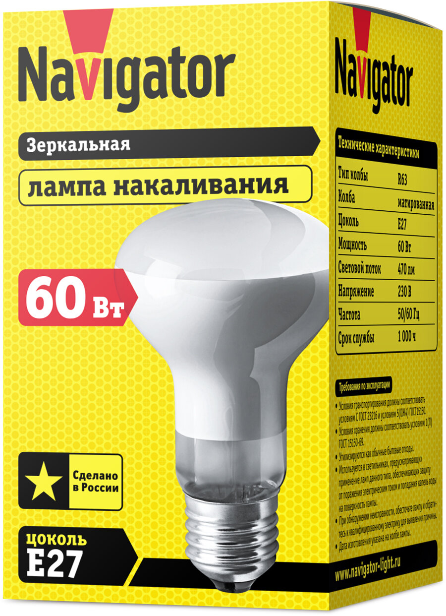 Зеркальная лампа Navigator накаливания ЗК, 60ВТ, R63, 230В. Е27, матовая, 94321