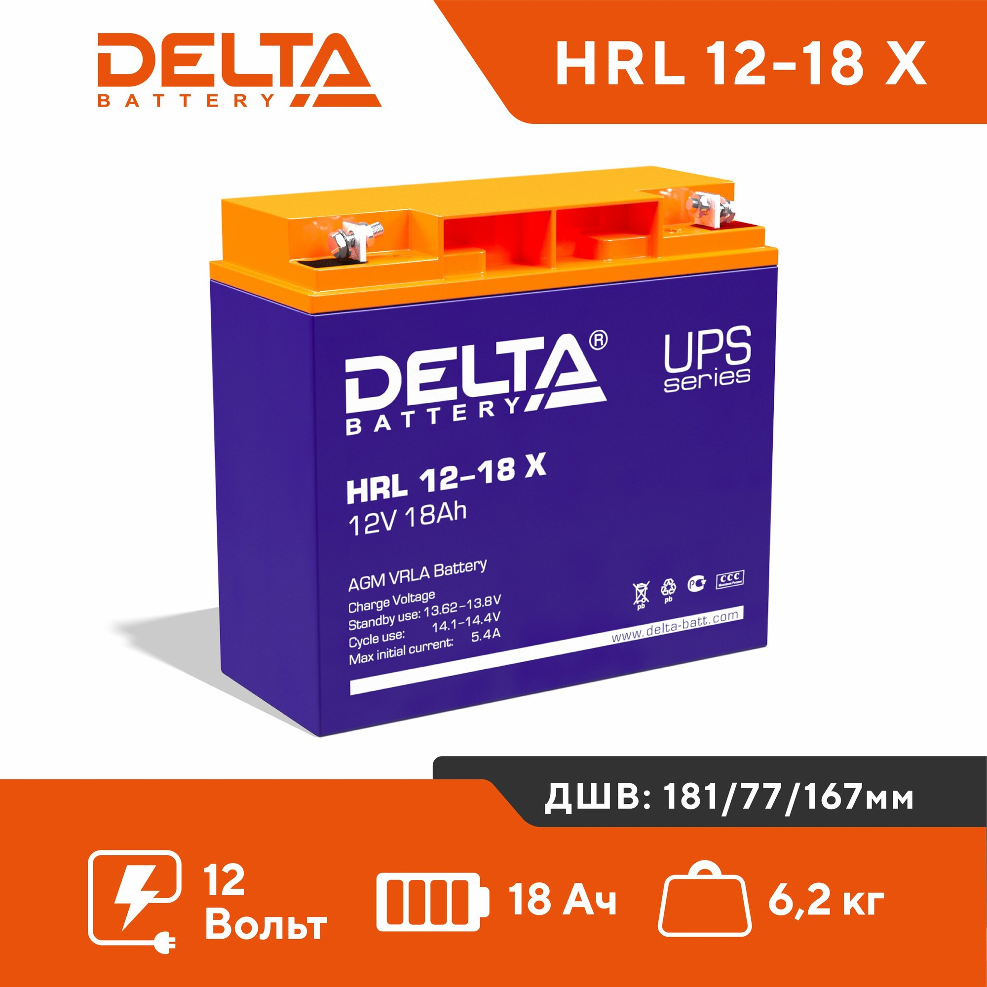 Батарея для ИБП Delta HRL 12-18 X 12В 18Ач информация: