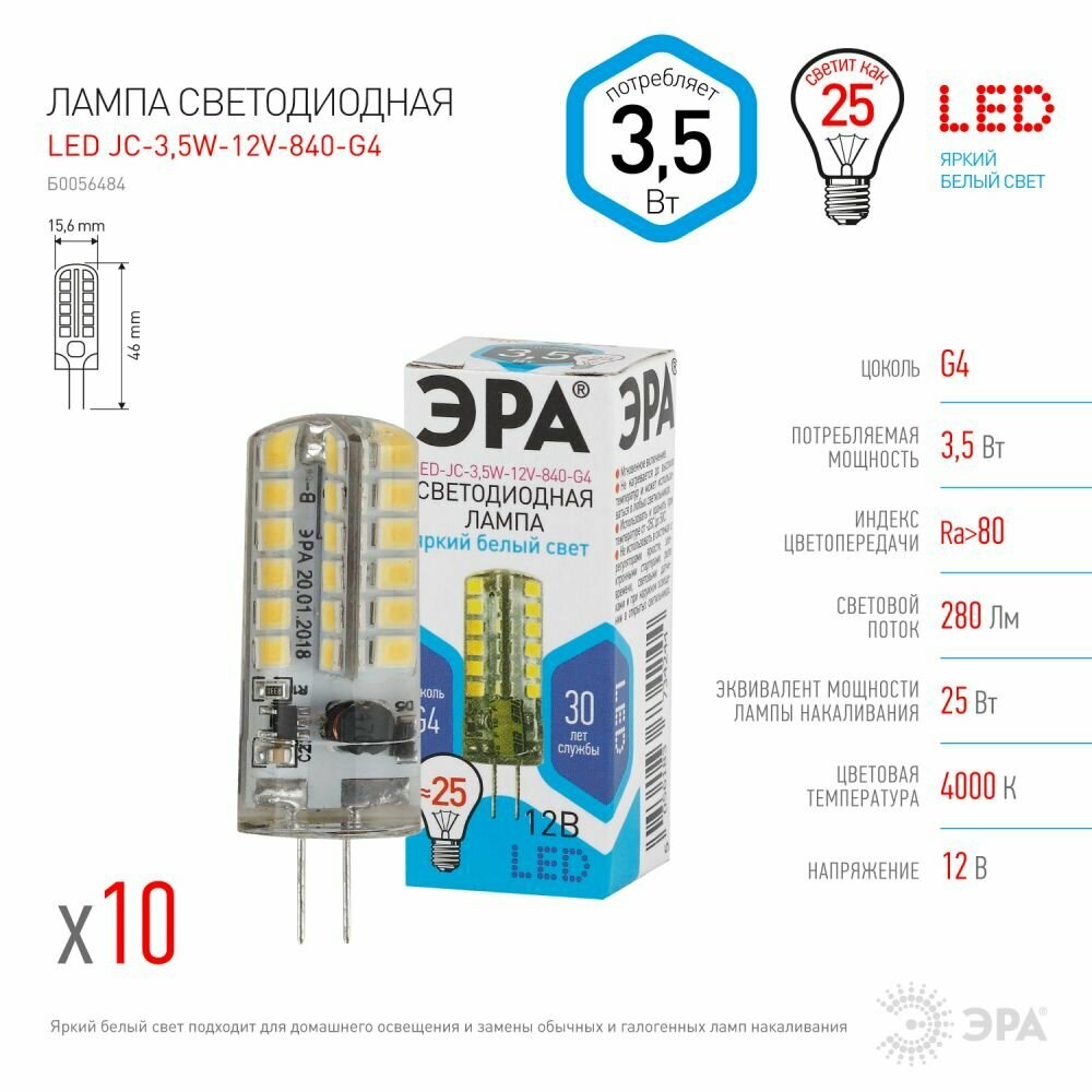 Лампочки светодиодные ЭРА STD LED JC-3,5W-12V-840-G4 G4 3,5 Вт капсула теплый белый свет набор 10 штук информация:
