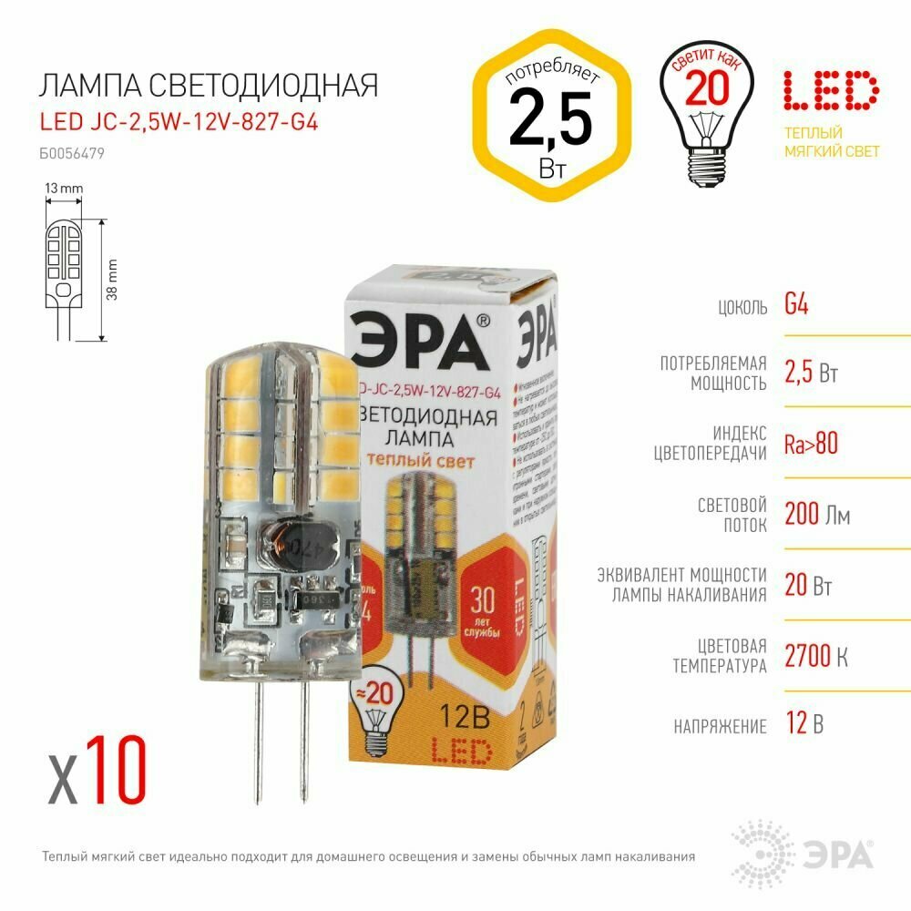 Набор светодиодных лампочек ЭРА LED-JC-2,5W-12V-827-G4 2700K Капсула 2,5 Вт 10 штук информация:
