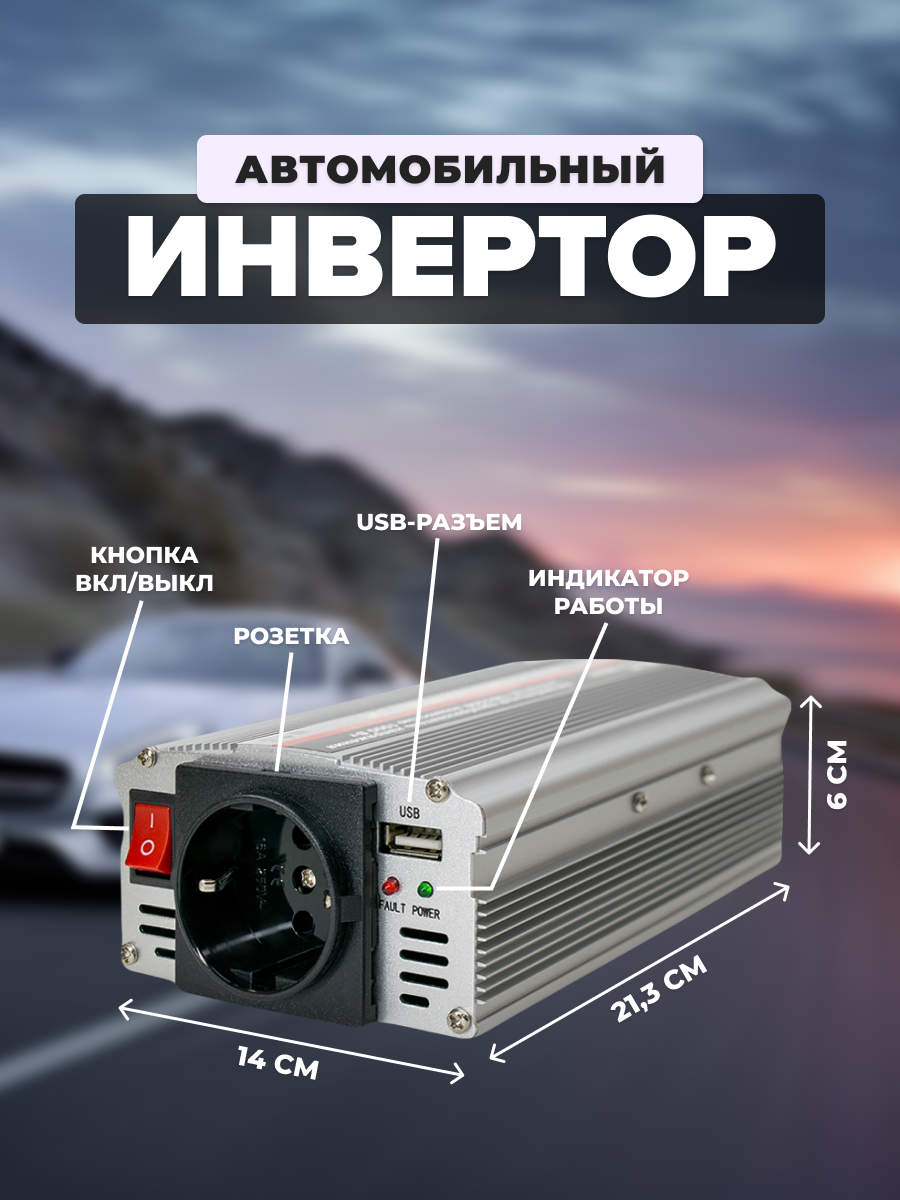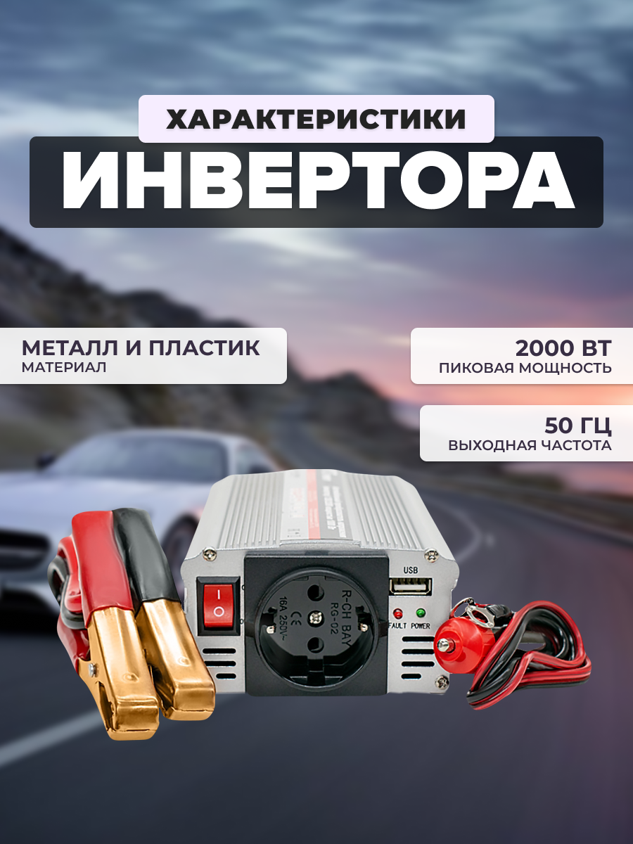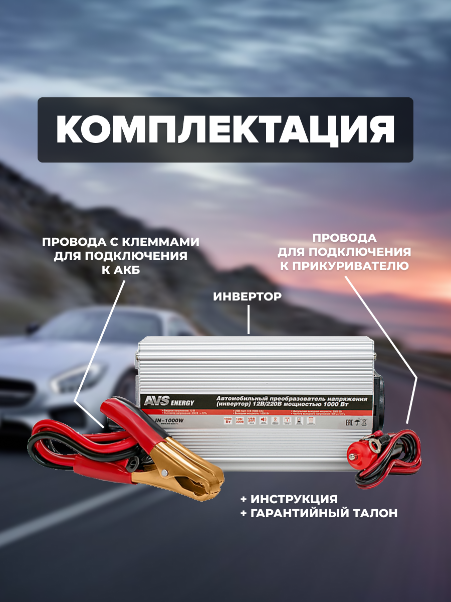 | Комплектация | Преобразователь (Автомобильный инвертор 12/220V AVS IN-1000W) - 1шт. и провода |