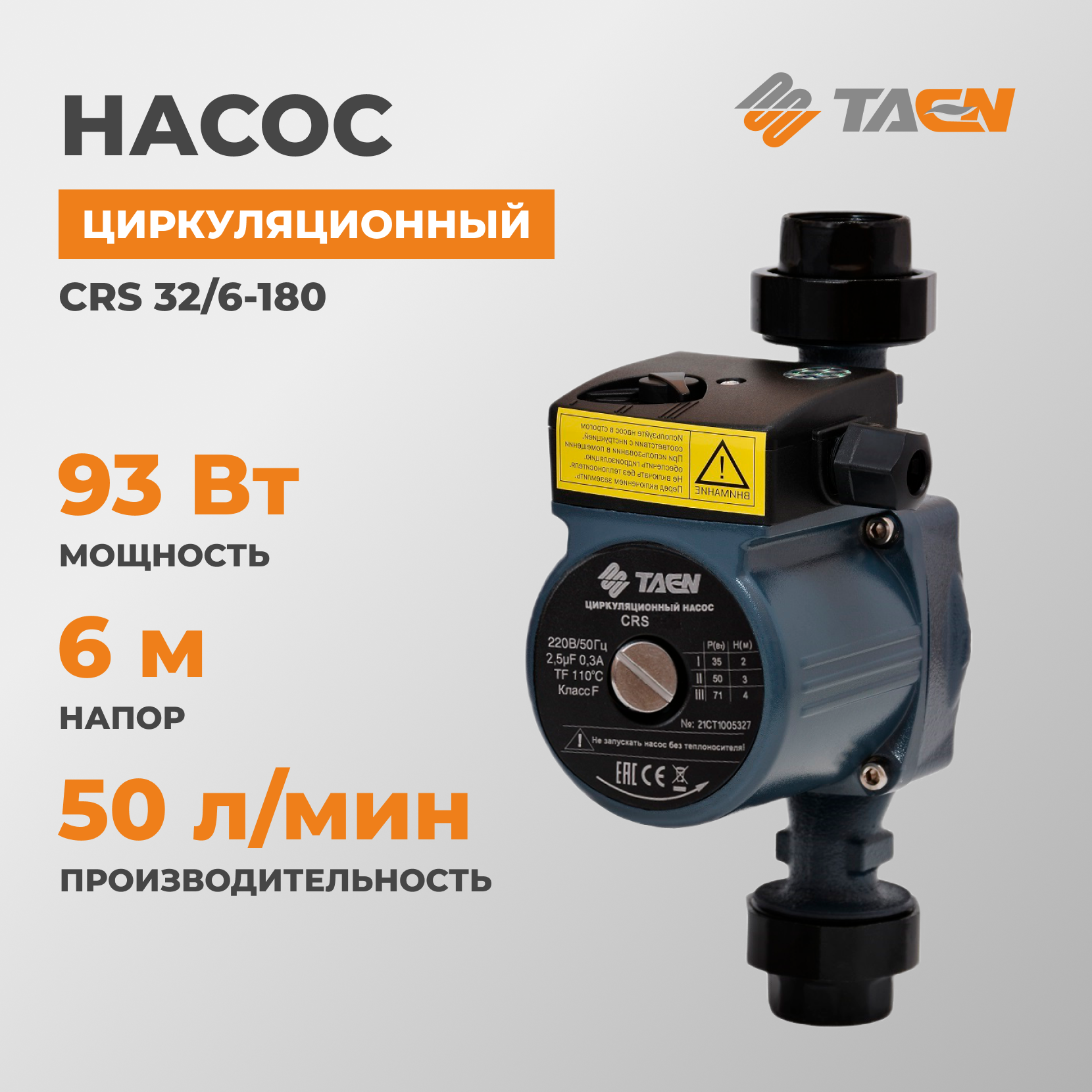 Циркуляционный насос TAEN CRS, 93Вт, 3м³/час, чугунный, с гайками информация: