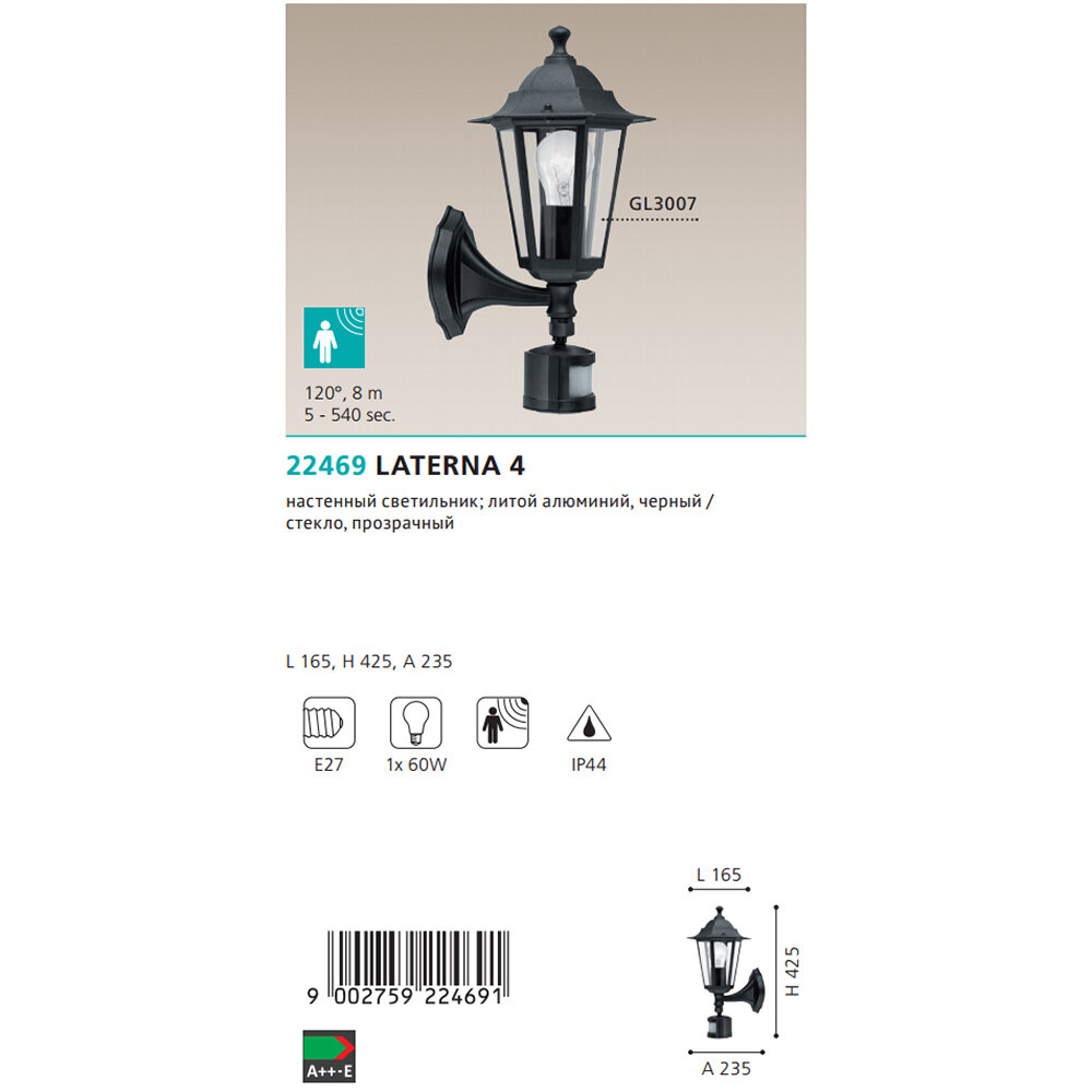 Уличный светильник EGLO LATERNA 4 22469 60 Вт E27 IP44 с датчиком движения информация: