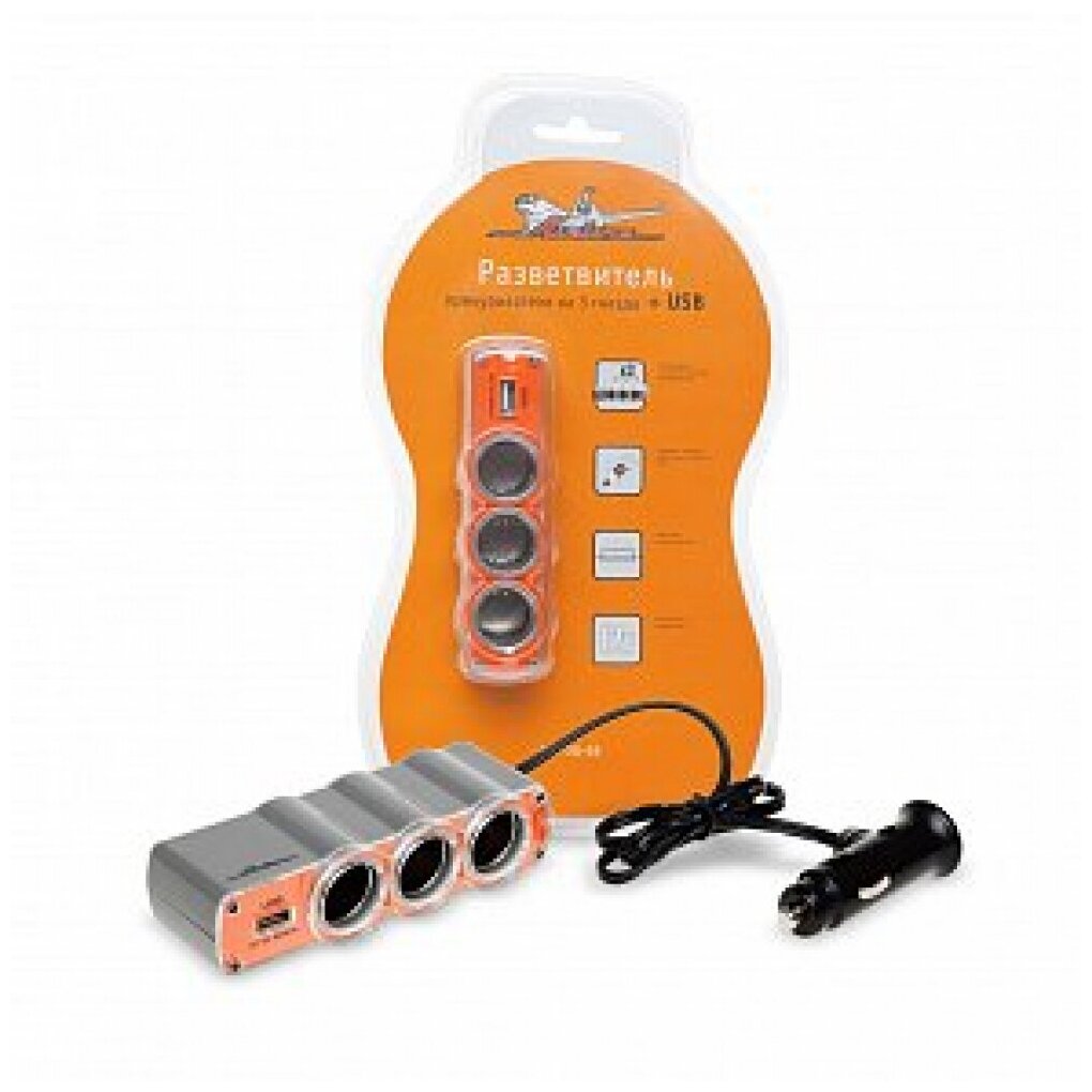 Отзывы на Прикуриватель-разветвитель 3 гнезда + USB (оранжевый) ASP-3U-03 AIRLINE