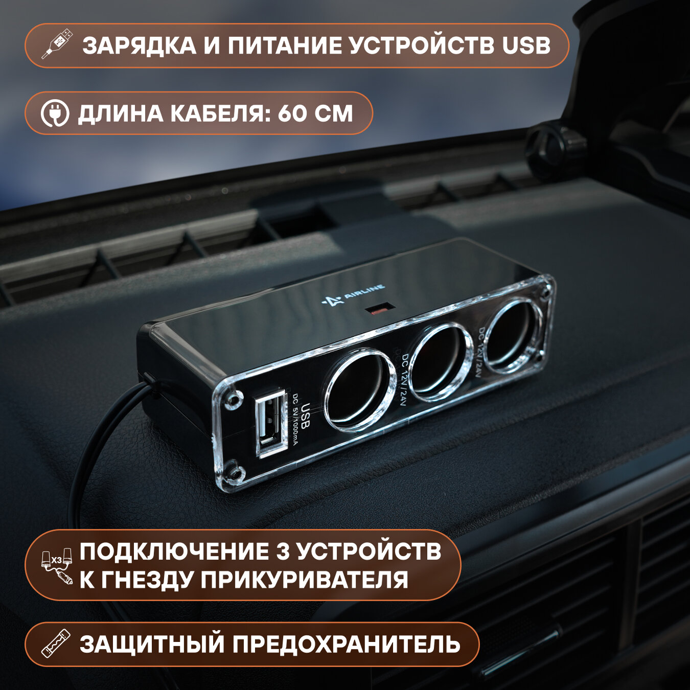 Разветвитель прикуривателя на 3 гнезда + 1 usb airline asp-3u-07 600 ₽