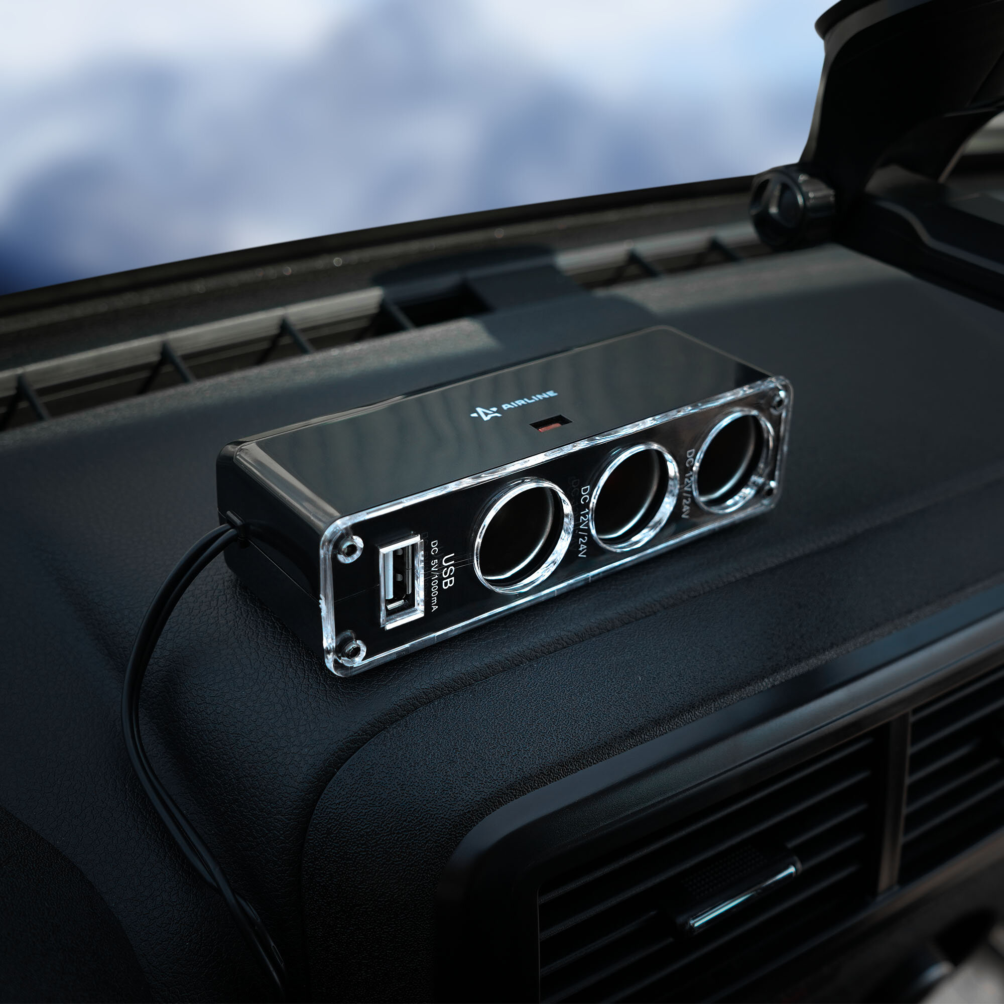 Разветвитель прикуривателя 3-х гнездовой 12-24V 1USB с удлинителем AIRLINE ASP-3U-07
