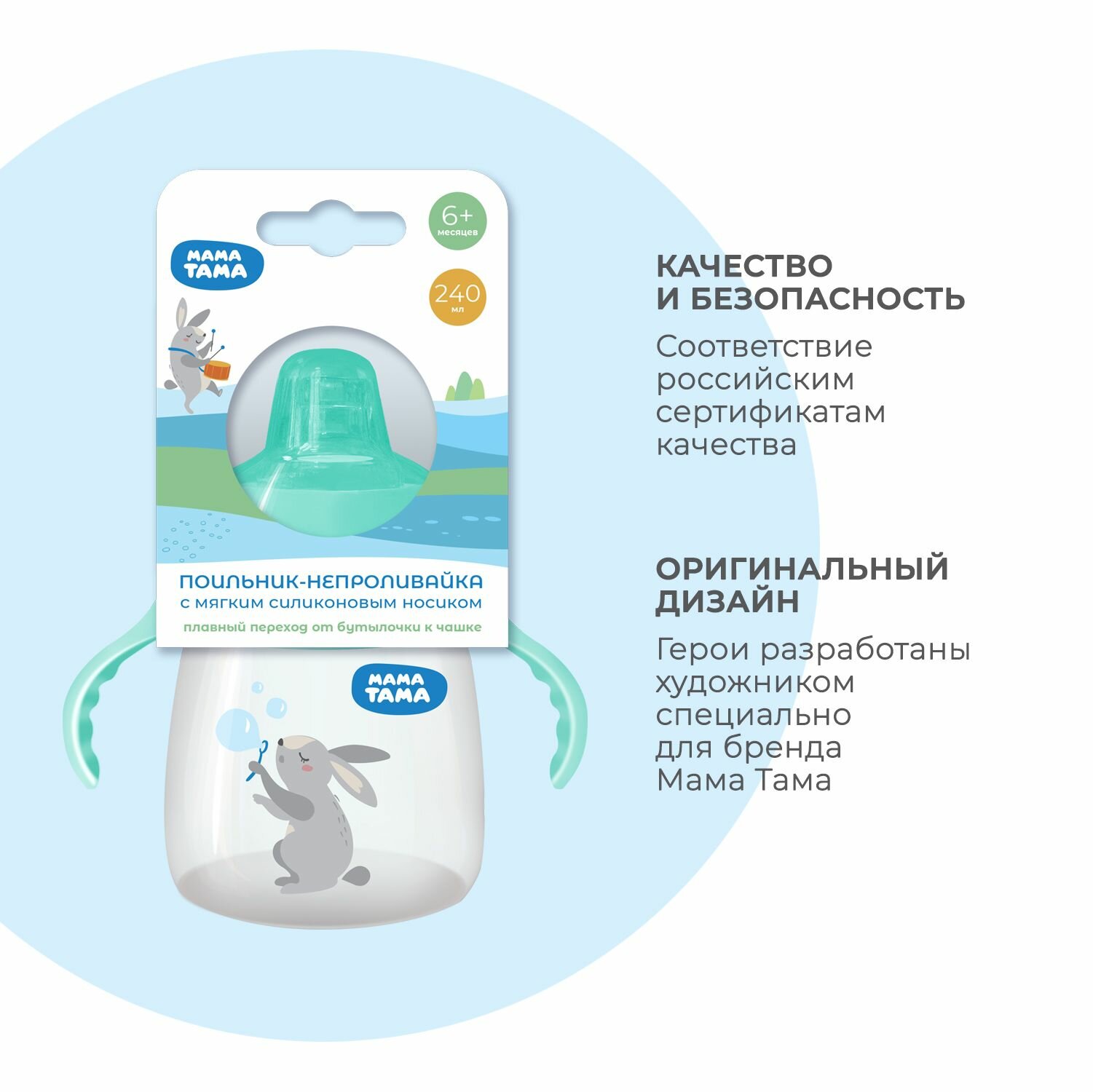 Поильник-непроливайка мама тама с силиконовым носиком 6мес.+, 240 мл., цвет: мятный 424 ₽