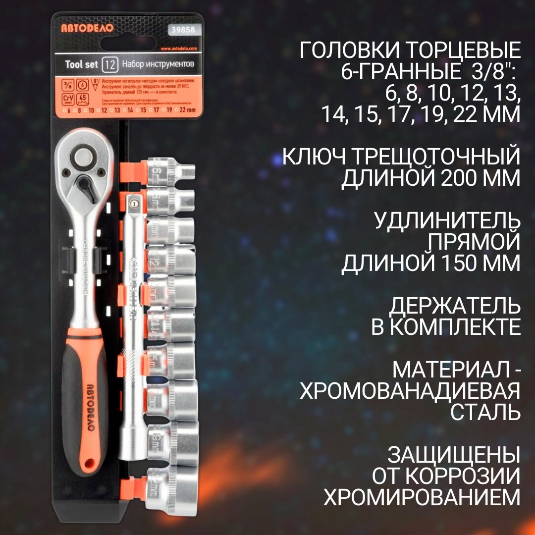 Набор головок торцевых с трещоткой 3/8", с удлинителем, от 6 до 22 мм, 12 предметов, АвтоDело 39858 информация: