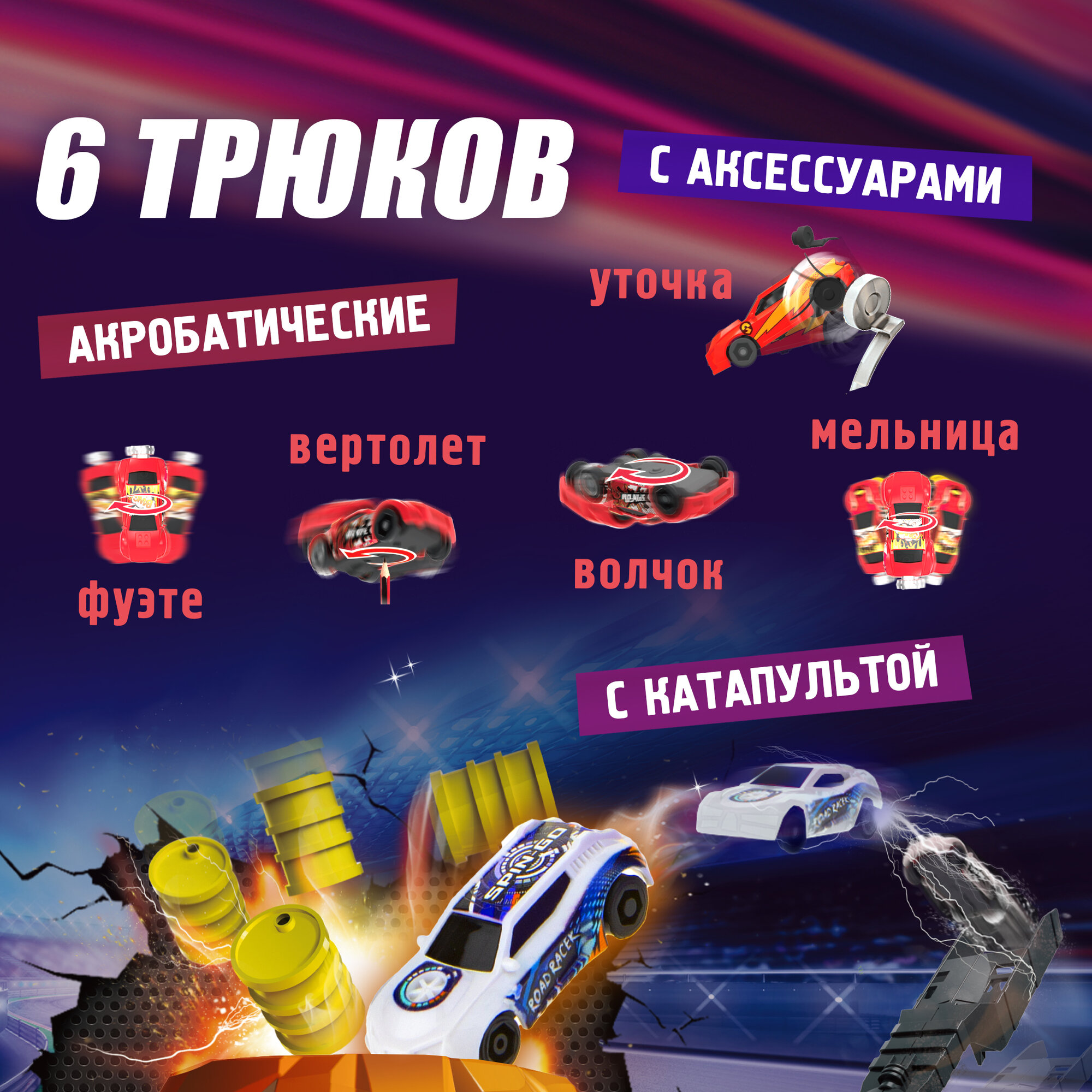 | Комплектация | машинка - 1 шт, аксессуар для трюков - 1 шт, детали трека - 3 шт, катапульта - 1 шт, база - 1 шт, бочка - 1 шт, конус - 2 шт |