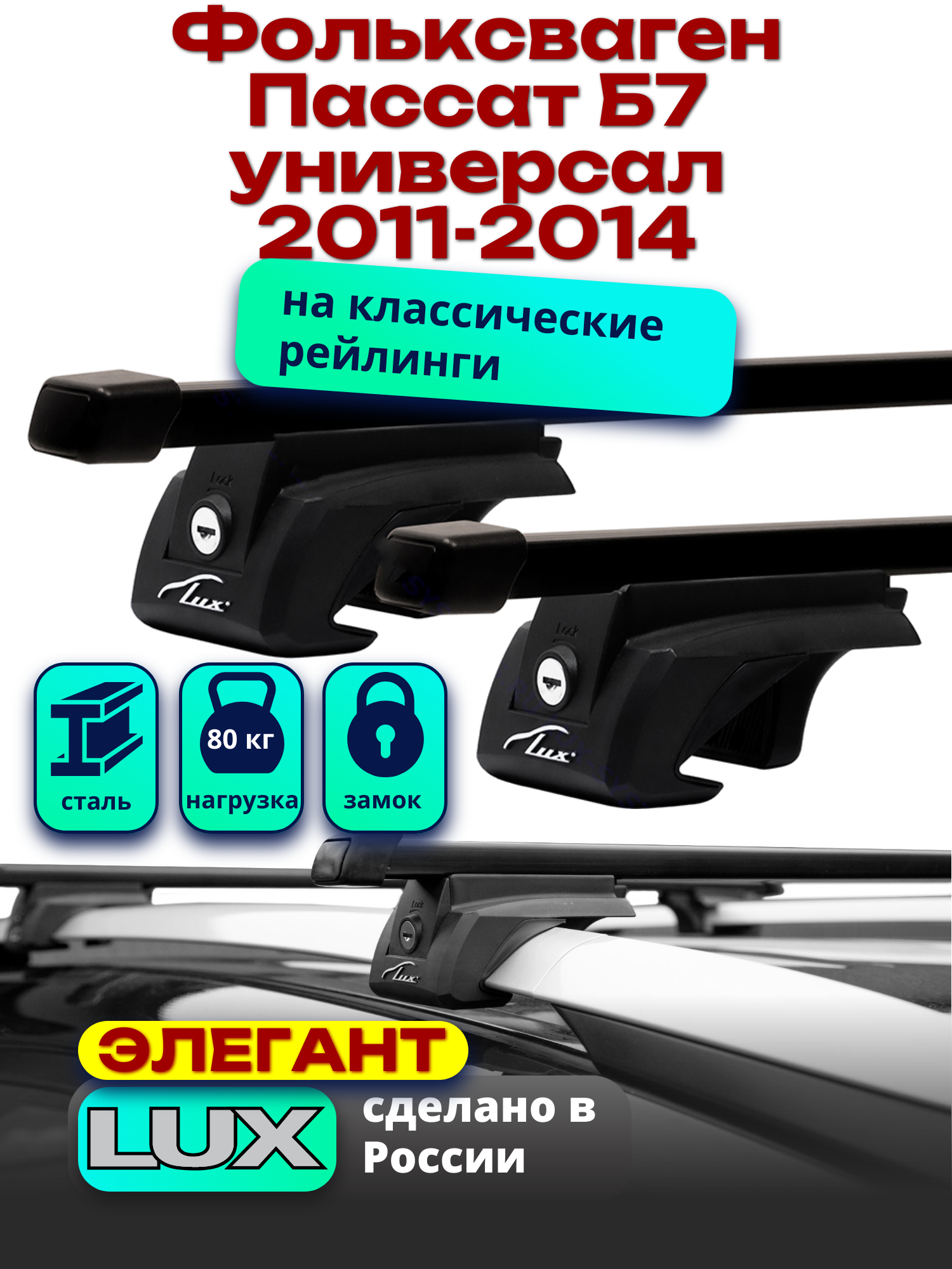Багажник на крышу Фольксваген Пассат Б7 универсал 2011-2014 на рейлинги, черный, прямоугольные дуги, LUX элегант информация: