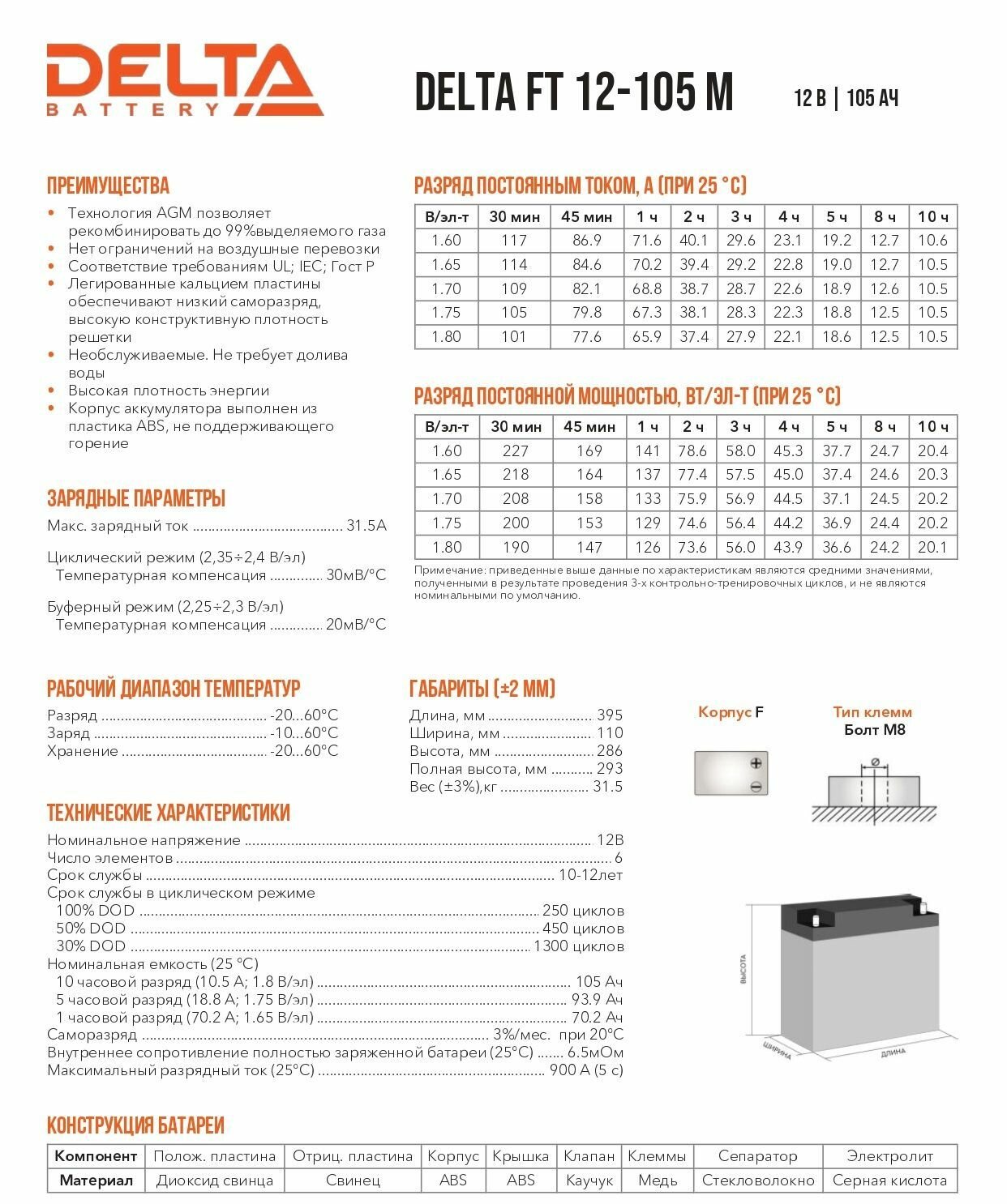 Аккумулятор АКБ фронт-терминальный Delta FT 12-105 M 12 Вольт 105 Ампер (12V 105 Ah) информация: