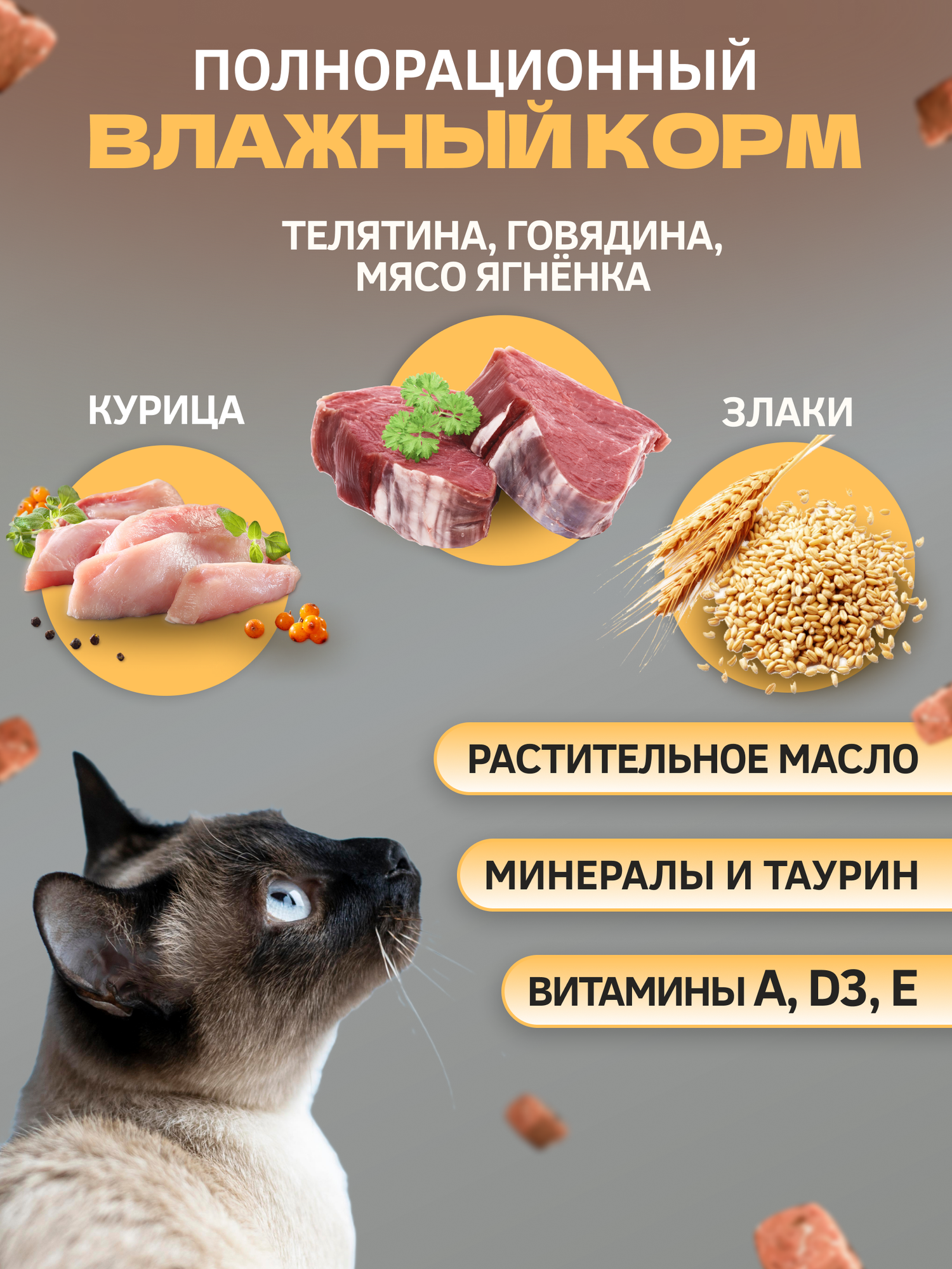 | Состав | мясо и субпродукты животного происхождения (телятина не менее 10%, мясо ягненка не менее 10%, говядина не менее 10%, курица не менее 10%), растительное масло, злаки, минеральные вещества, витамины (А, D3, E), таурин |