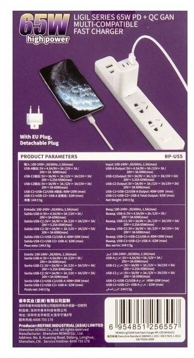 Сетевое зарядное устройство Remax RP-U55, три разъема, 65Вт, GaN информация: