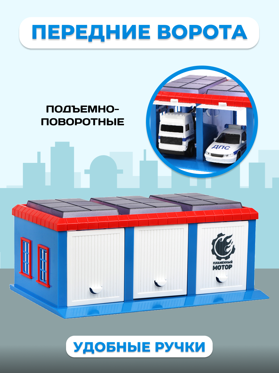 Гараж Пламенный мотор Полиция ДПС, открываются передние и задние ворота, эвакуатор, патрульная машина металлические 1:43 (870273)