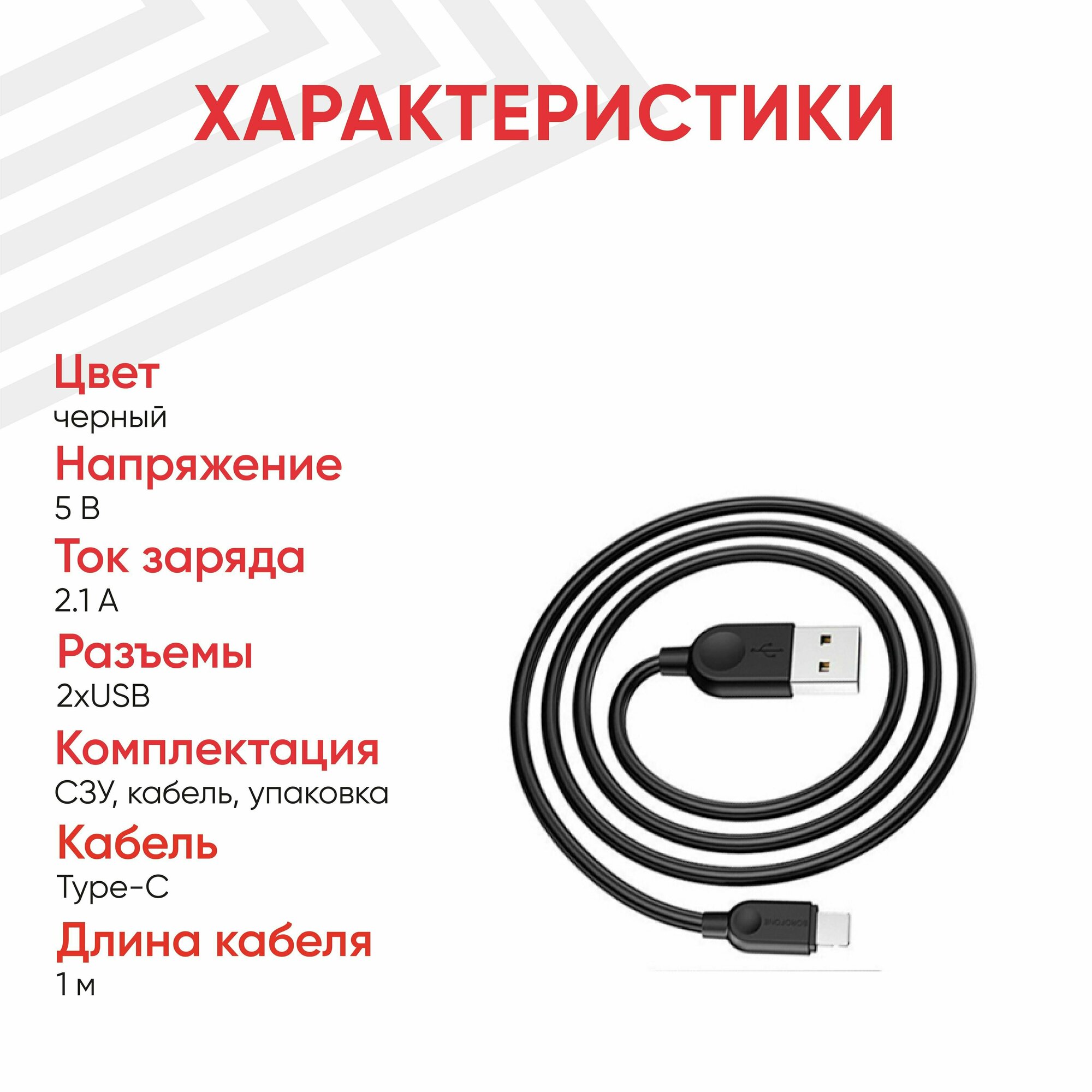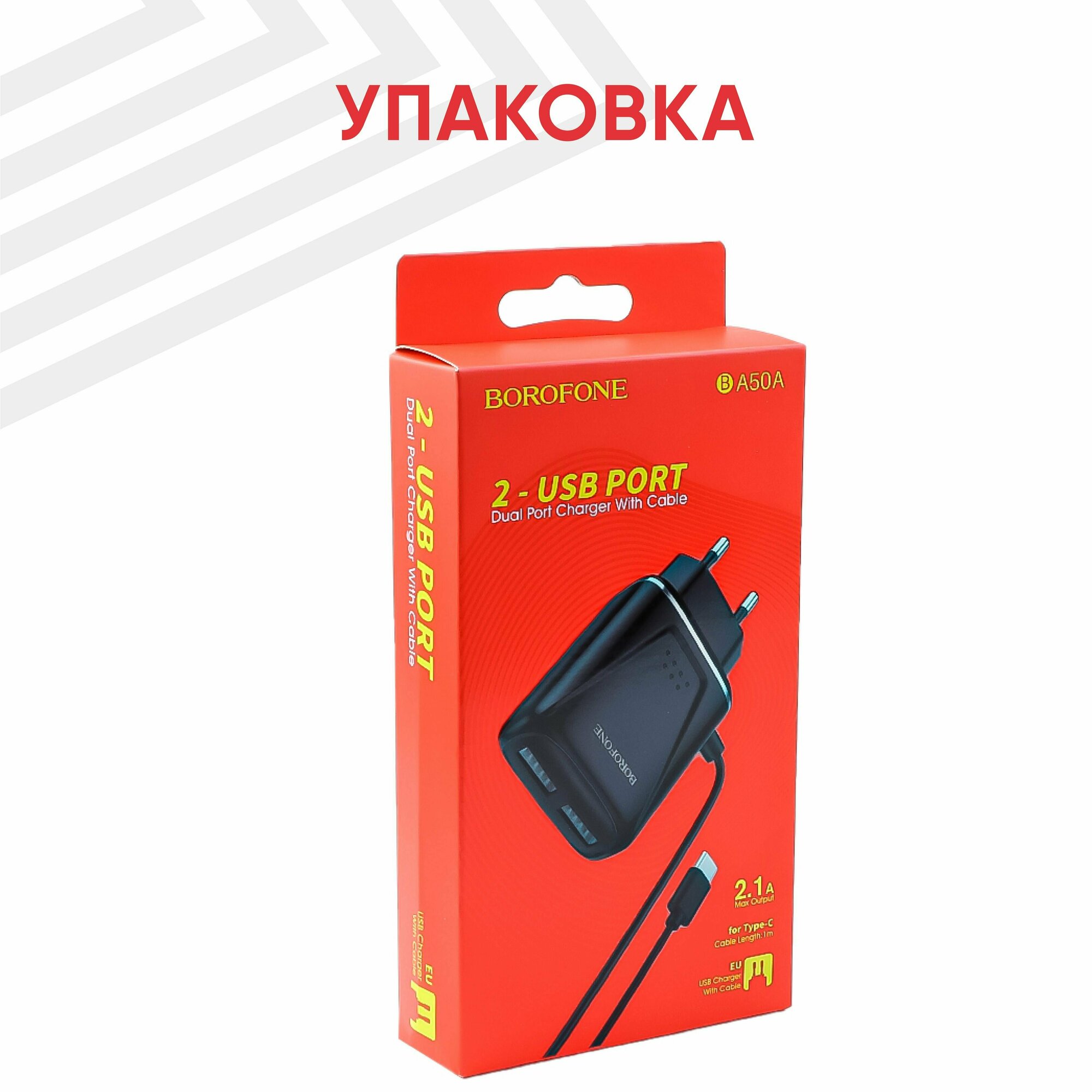 Сетевое зарядное устройство Borofone BA50A, 2 USB Type-A, 2.1А, интегрированный кабель Type-C, 1 метр, черный информация: