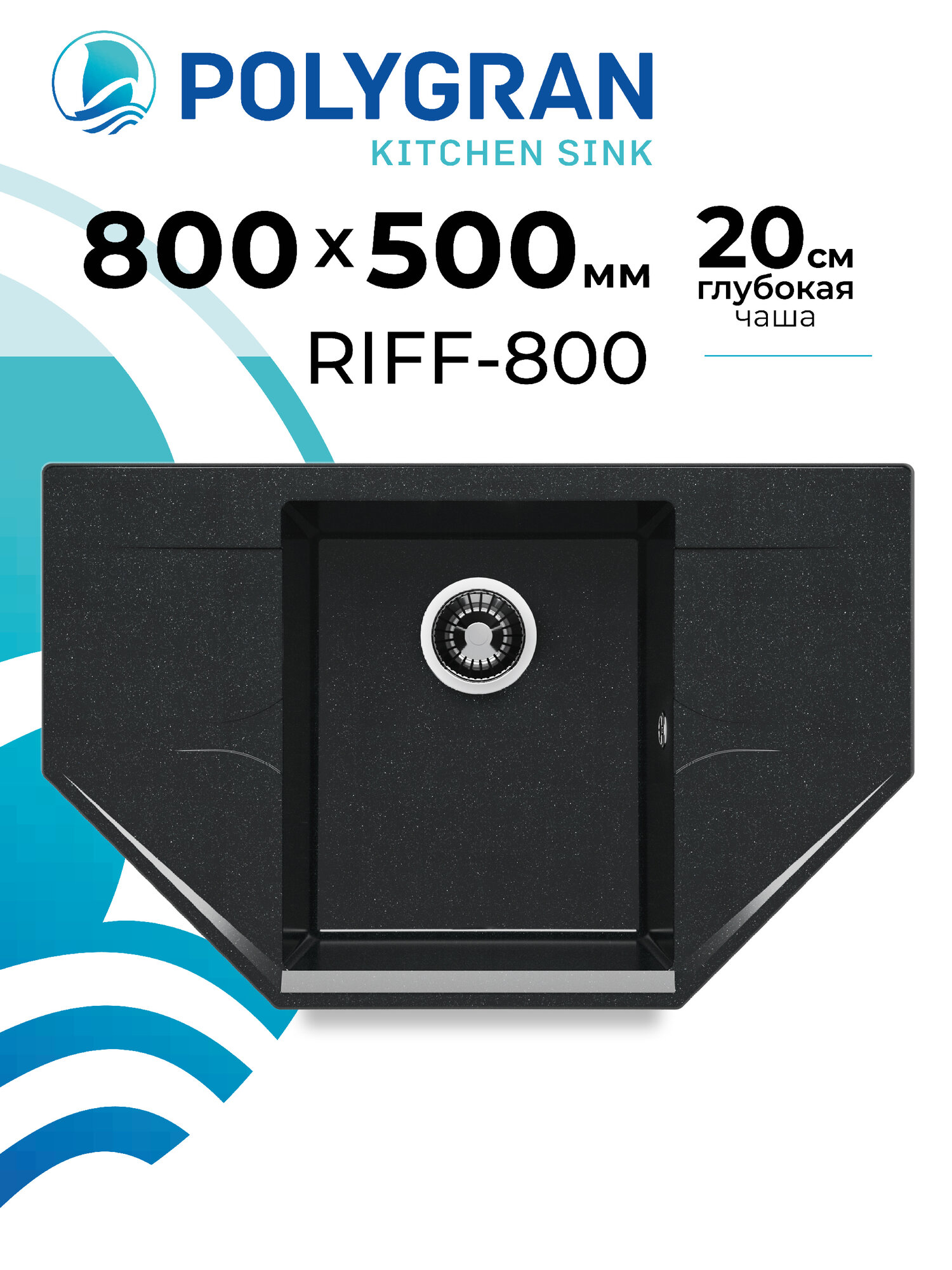 Мойка для кухни каменная POLYGRAN Riff-800, черная, врезная, с крылом (№16 Черный) 9 445 ₽