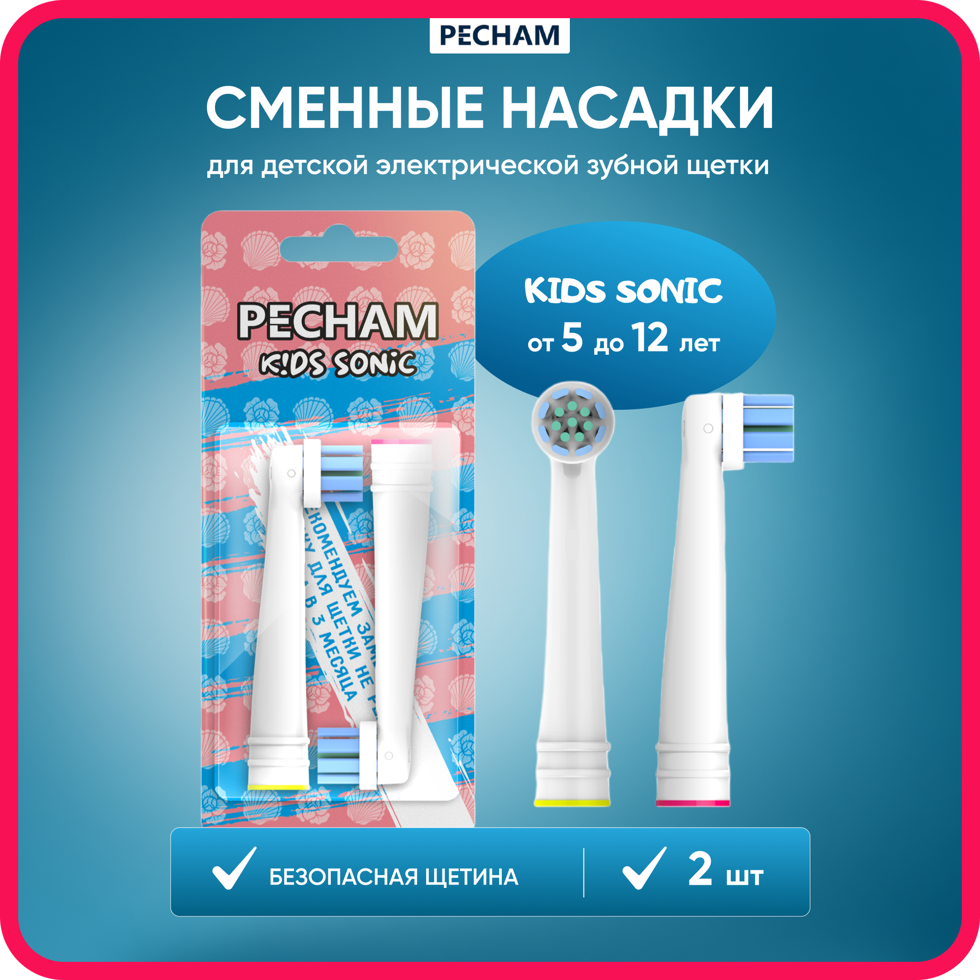 Насадки для электрической зубной щётки PECHAM Sonic Kids, для детей, 2 штуки информация:
