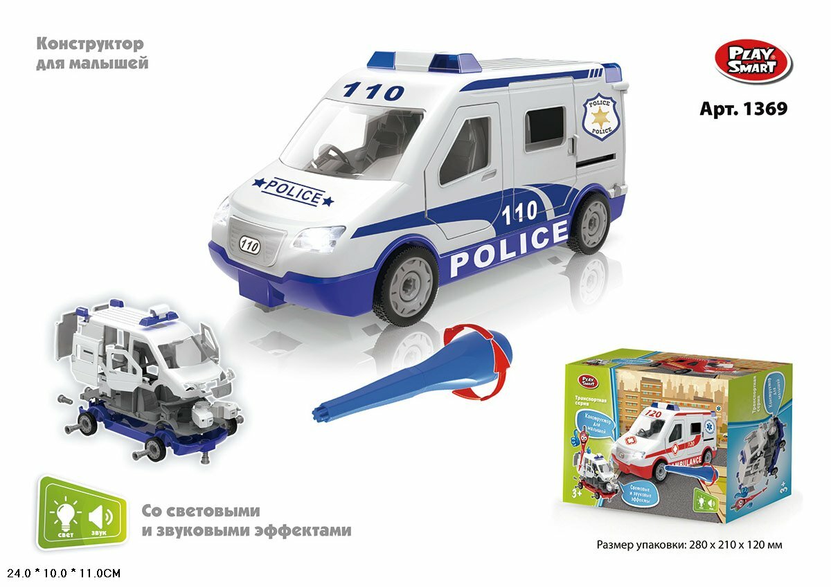 Конструктор - машина "Полиция фургон", винтовой конструктор машинка, инерция, свет + свет, полицейская машинка (собирайка), Play smart 1369